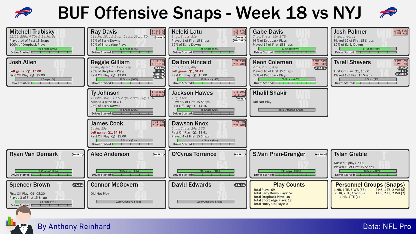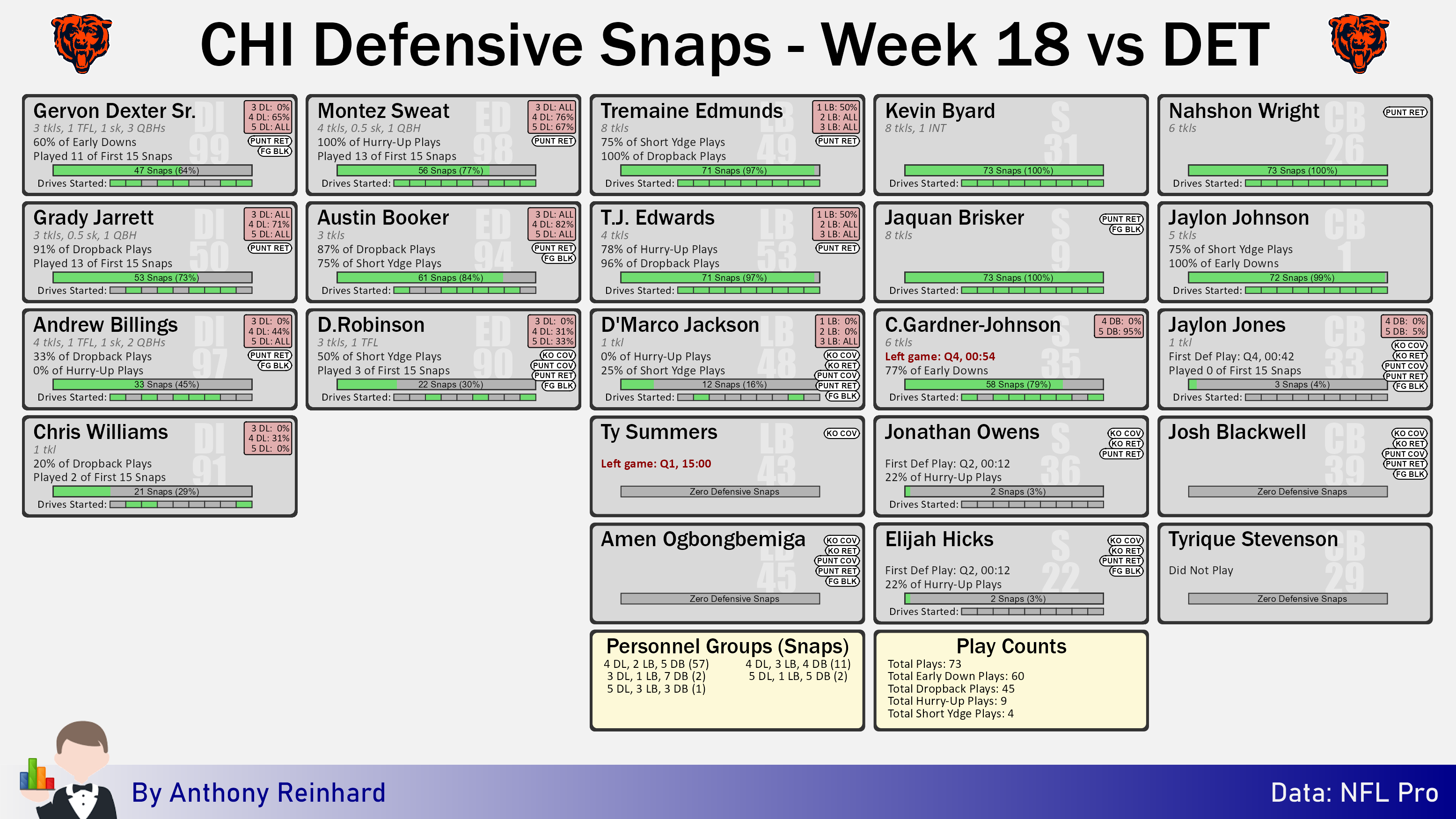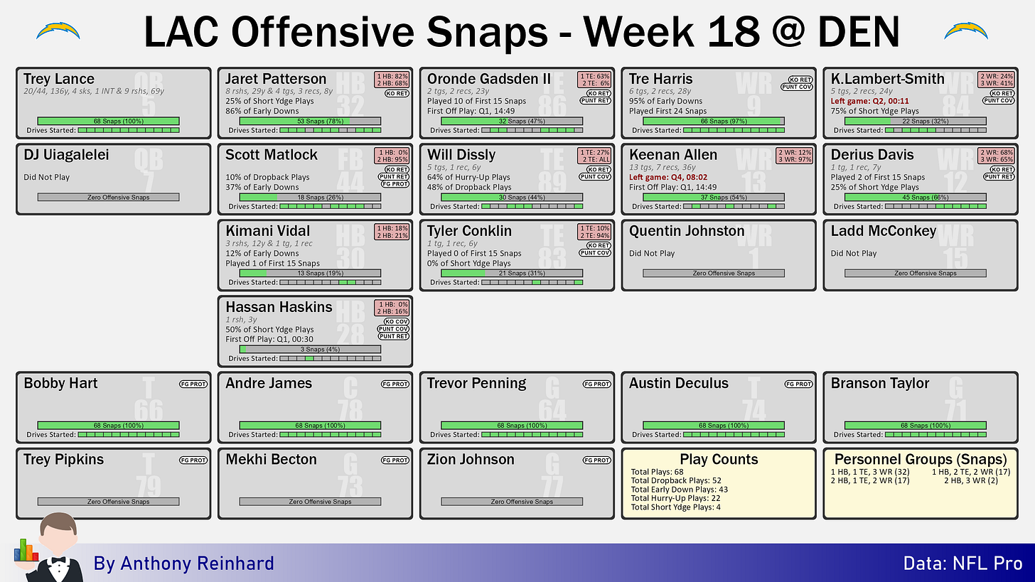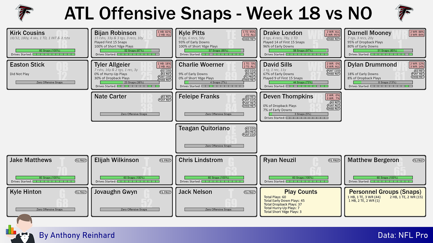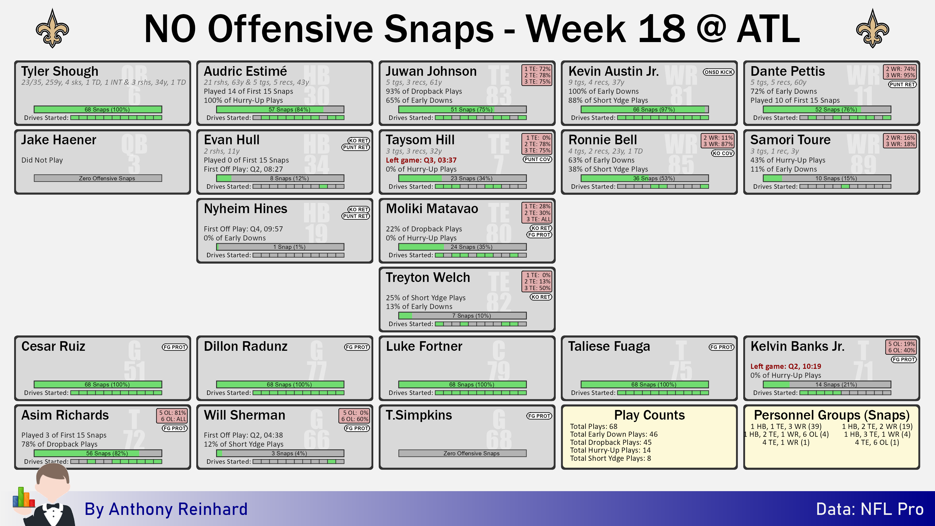 Snap Counts: Week 18Snap Count graphs for each team in Week 18Anthony ReinhardJan 05, 20261ShareCAR-TBSEA-SFNO-ATLCLE-CININD-HOUTEN-JAXGB-MINDAL-NYGNYJ-BUFDET-CHILAC-DENARI-LAKC-LVMIA-NEWAS-PHIBAL-PITSubscribePreviousNext