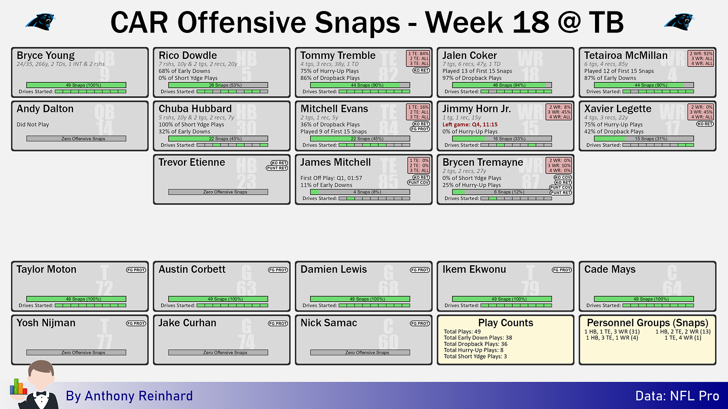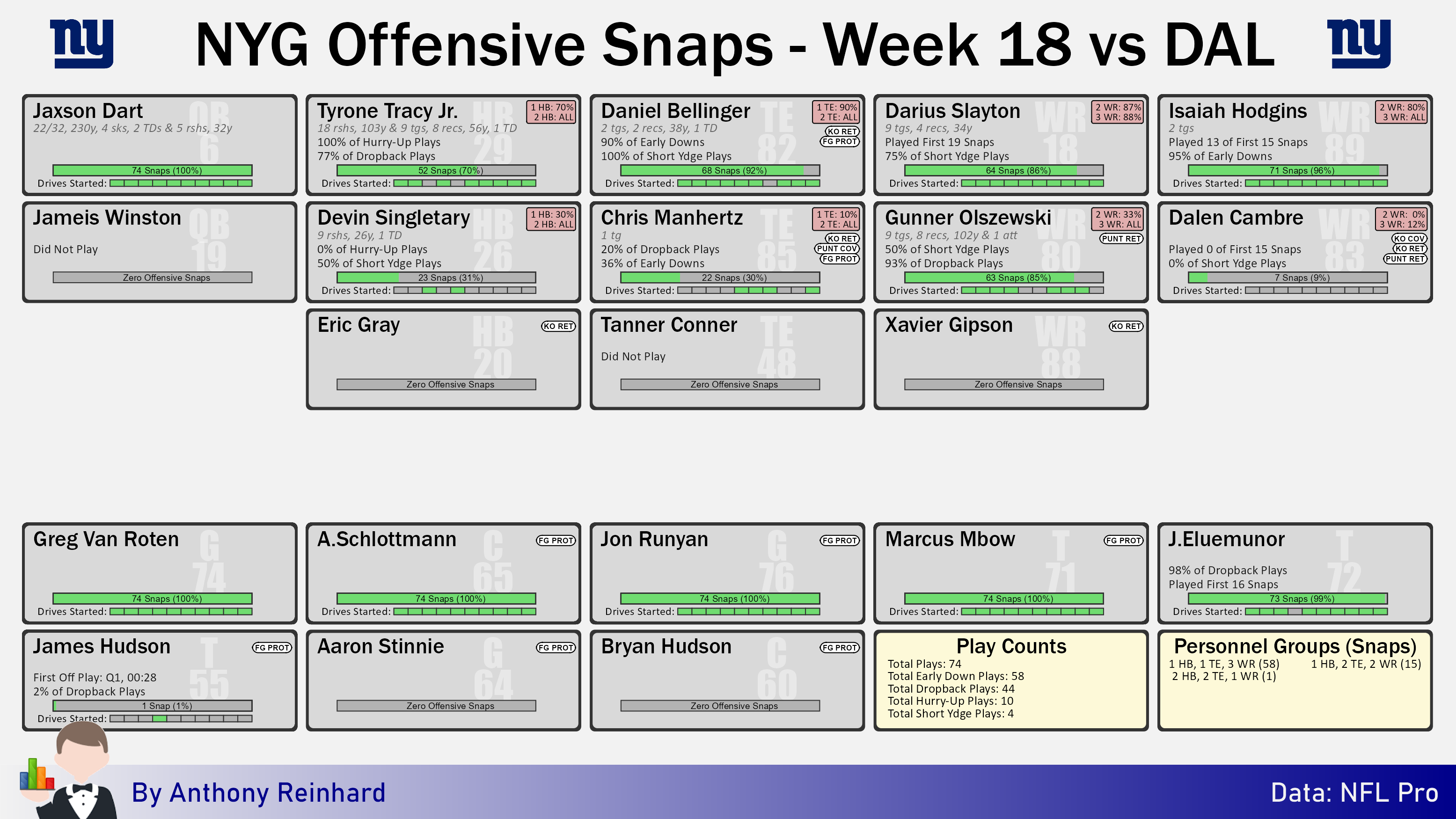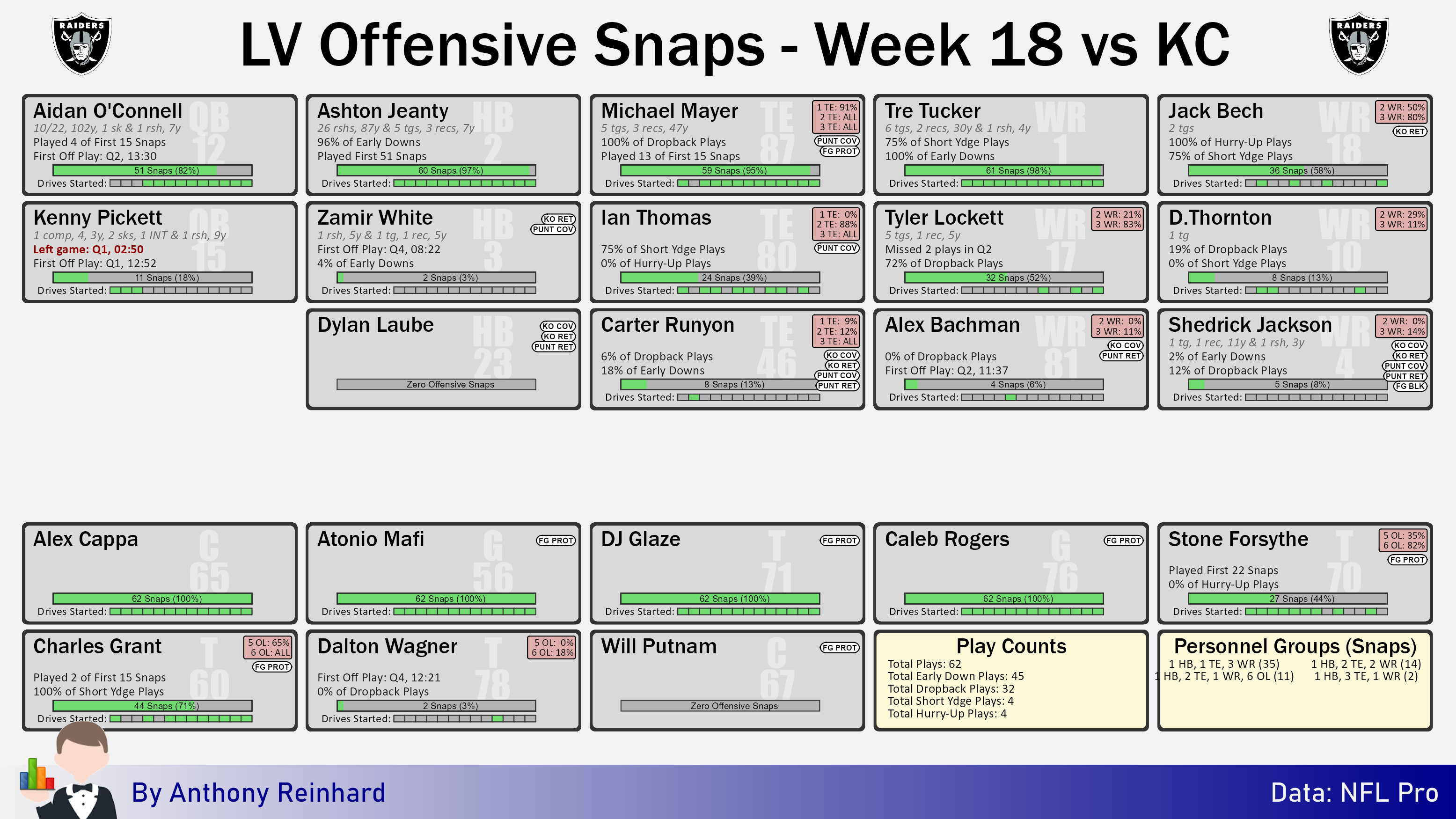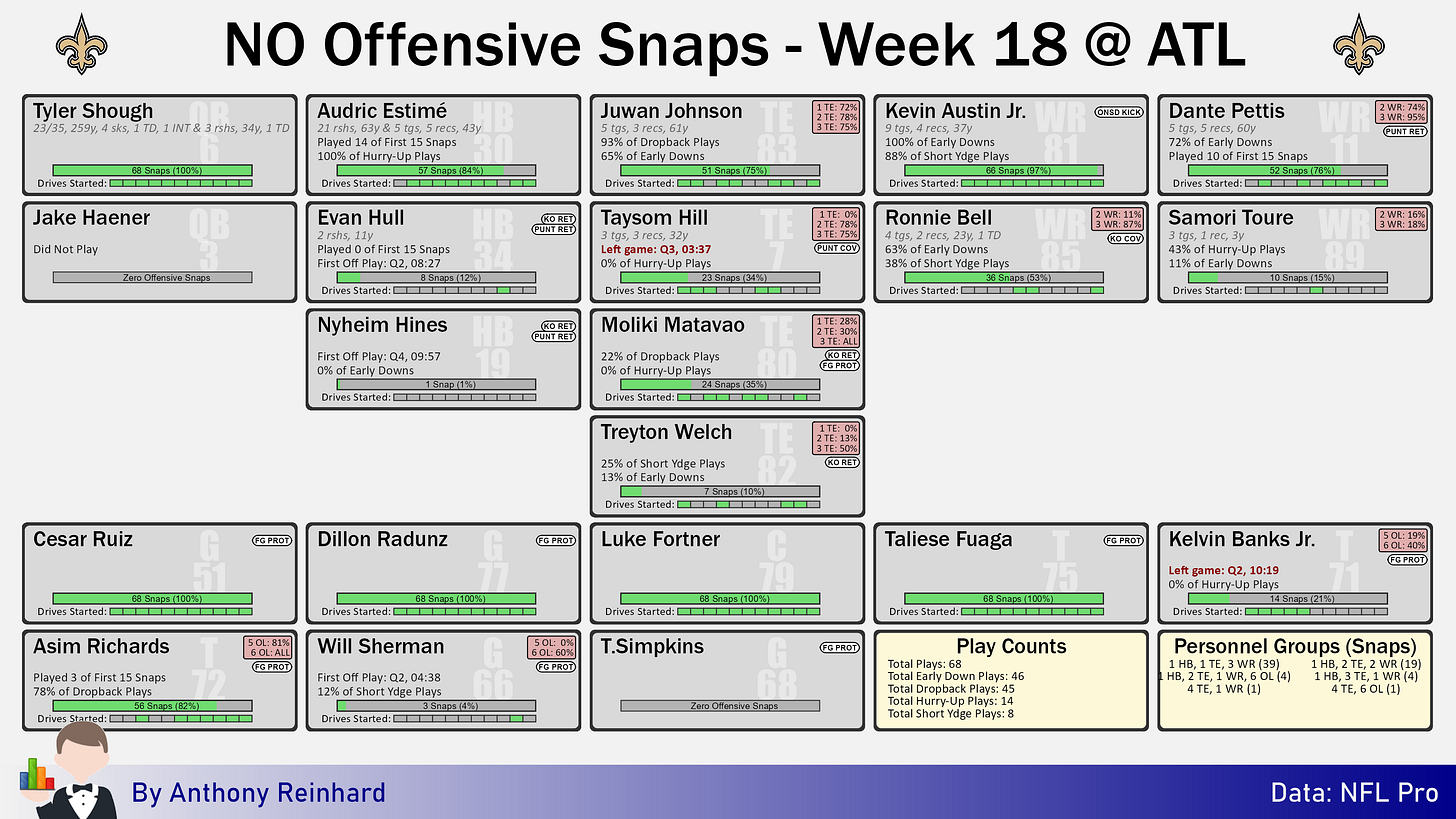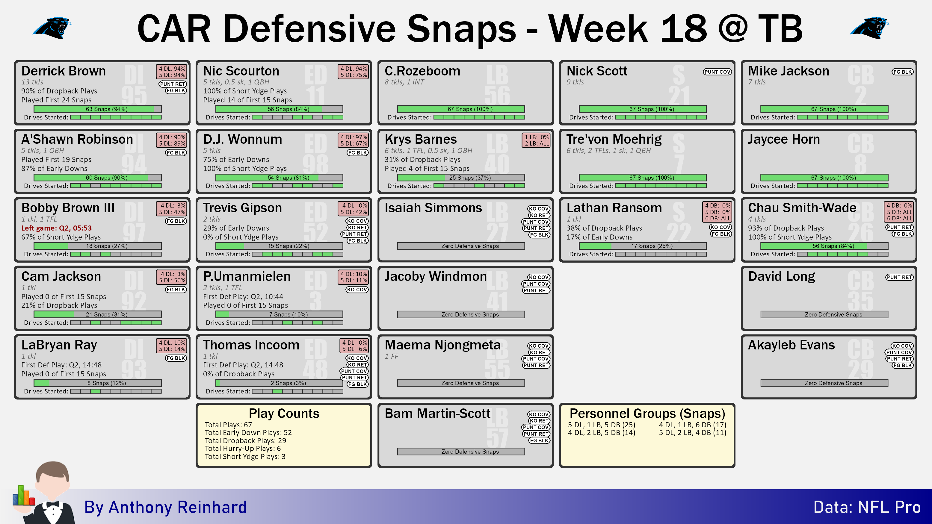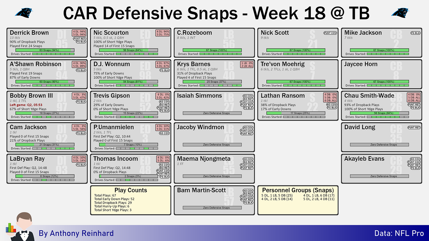 Snap Counts: Week 18Snap Count graphs for each team in Week 18Anthony ReinhardJan 05, 20261ShareCAR-TBSEA-SFNO-ATLCLE-CININD-HOUTEN-JAXGB-MINDAL-NYGNYJ-BUFDET-CHILAC-DENARI-LAKC-LVMIA-NEWAS-PHIBAL-PITSubscribePreviousNext