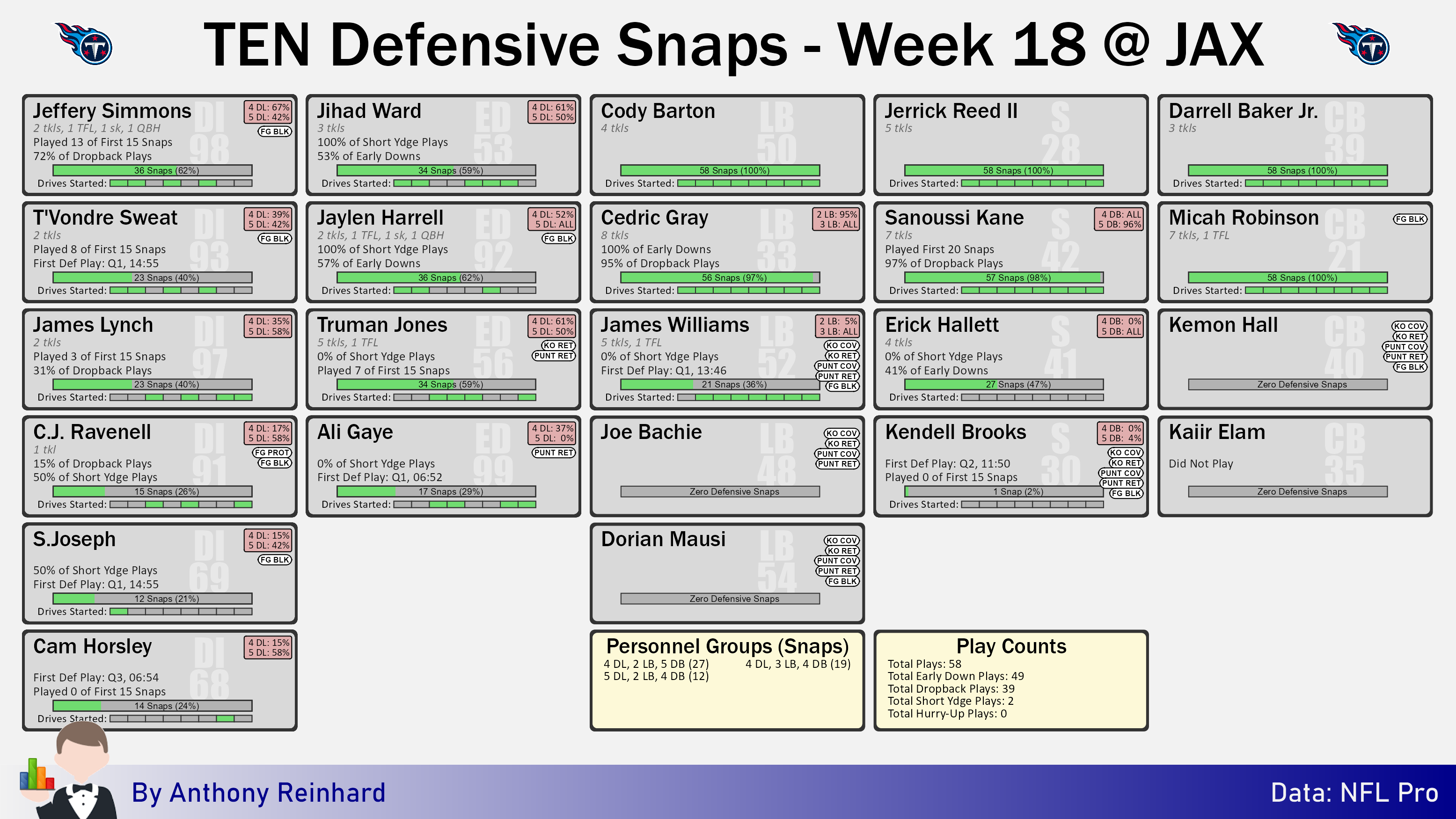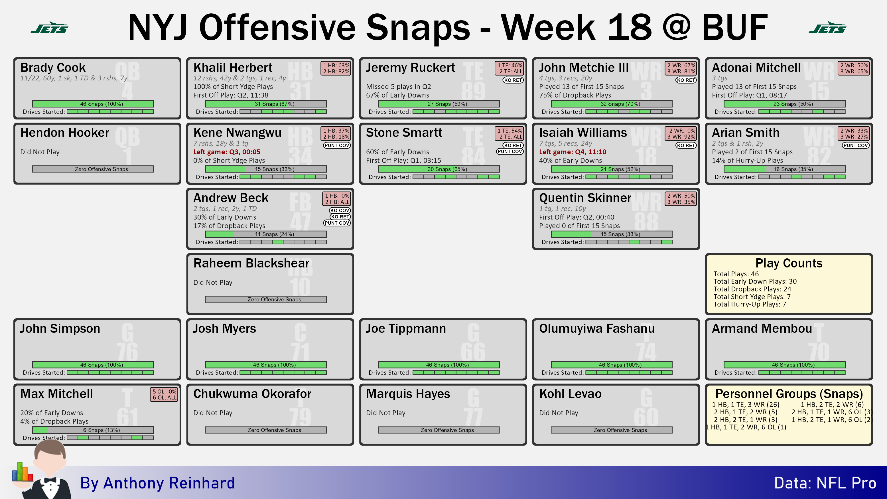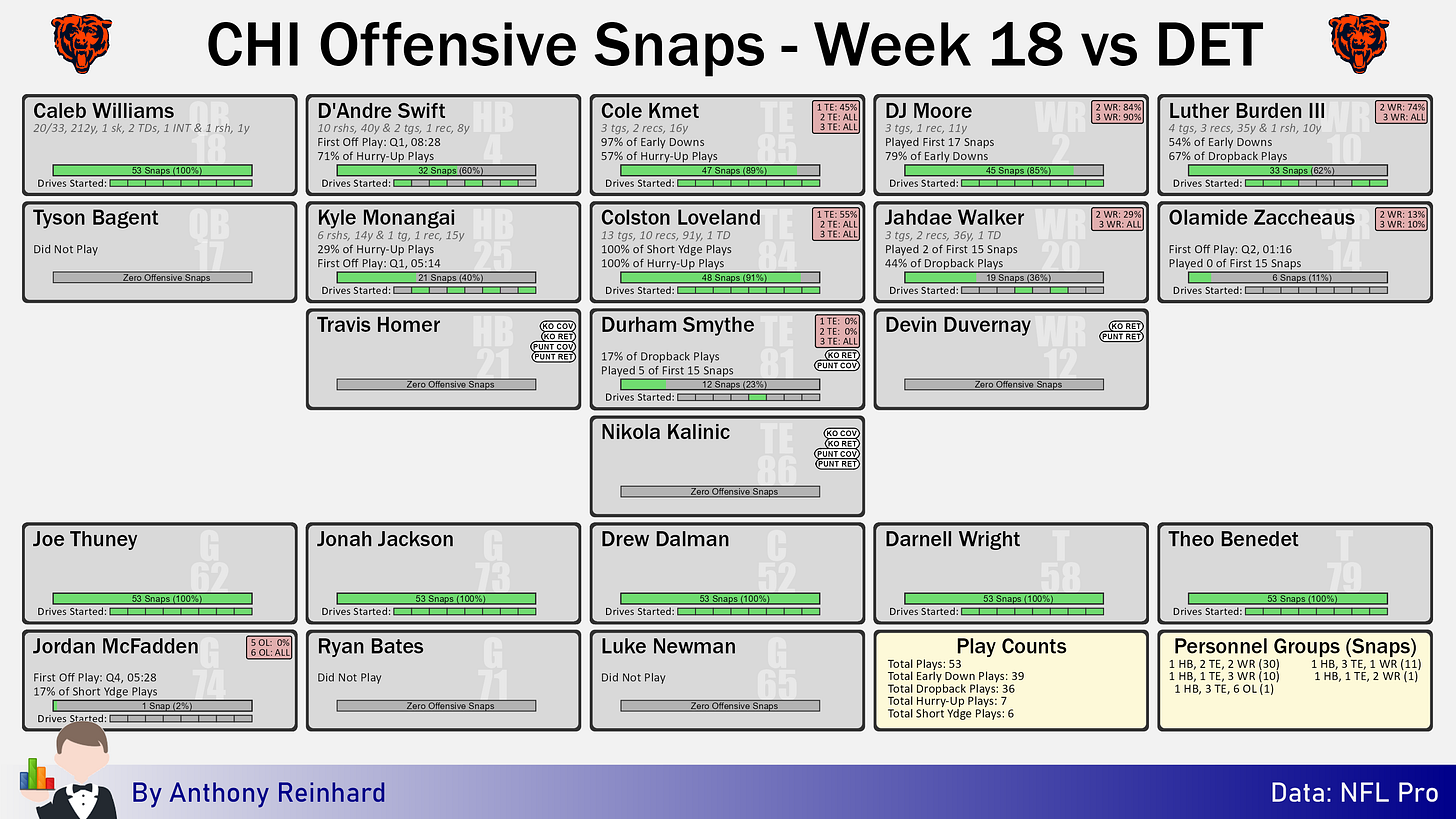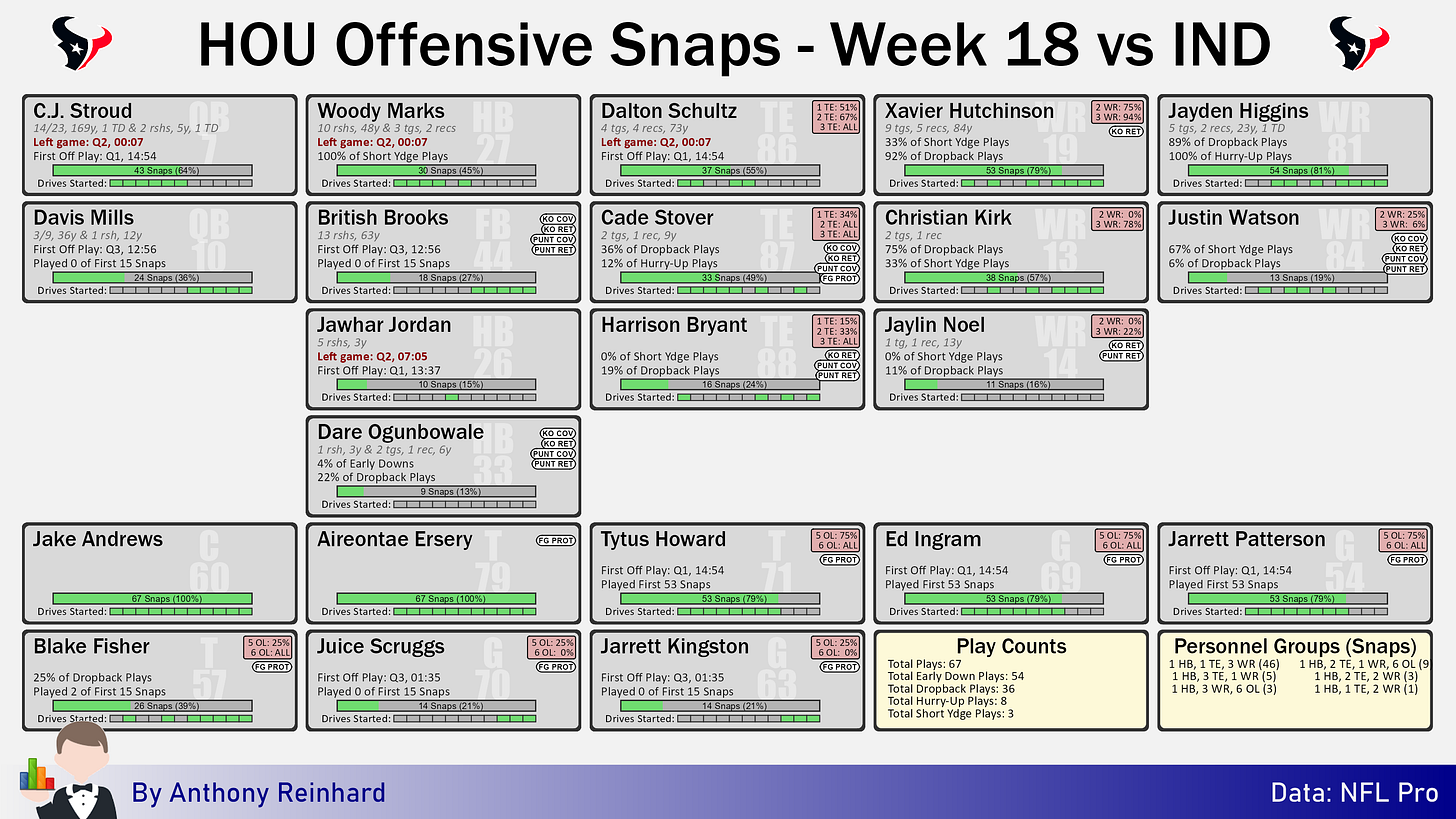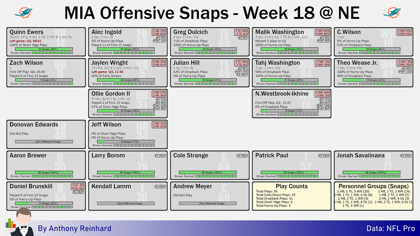 Snap Counts: Week 18Snap Count graphs for each team in Week 18Anthony ReinhardJan 05, 20261ShareCAR-TBSEA-SFNO-ATLCLE-CININD-HOUTEN-JAXGB-MINDAL-NYGNYJ-BUFDET-CHILAC-DENARI-LAKC-LVMIA-NEWAS-PHIBAL-PITSubscribePreviousNext