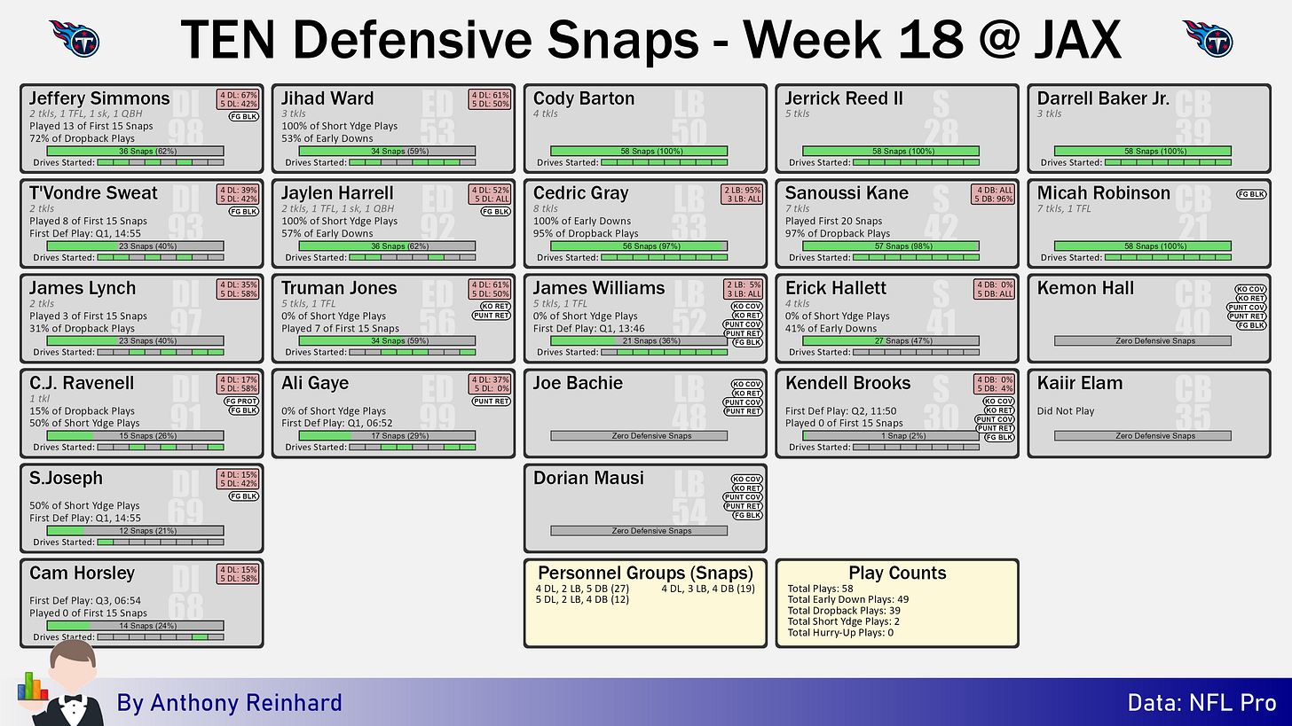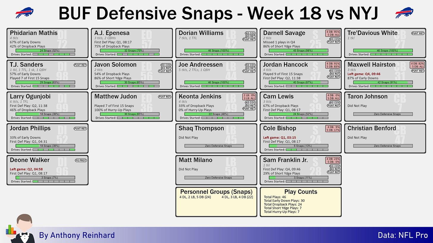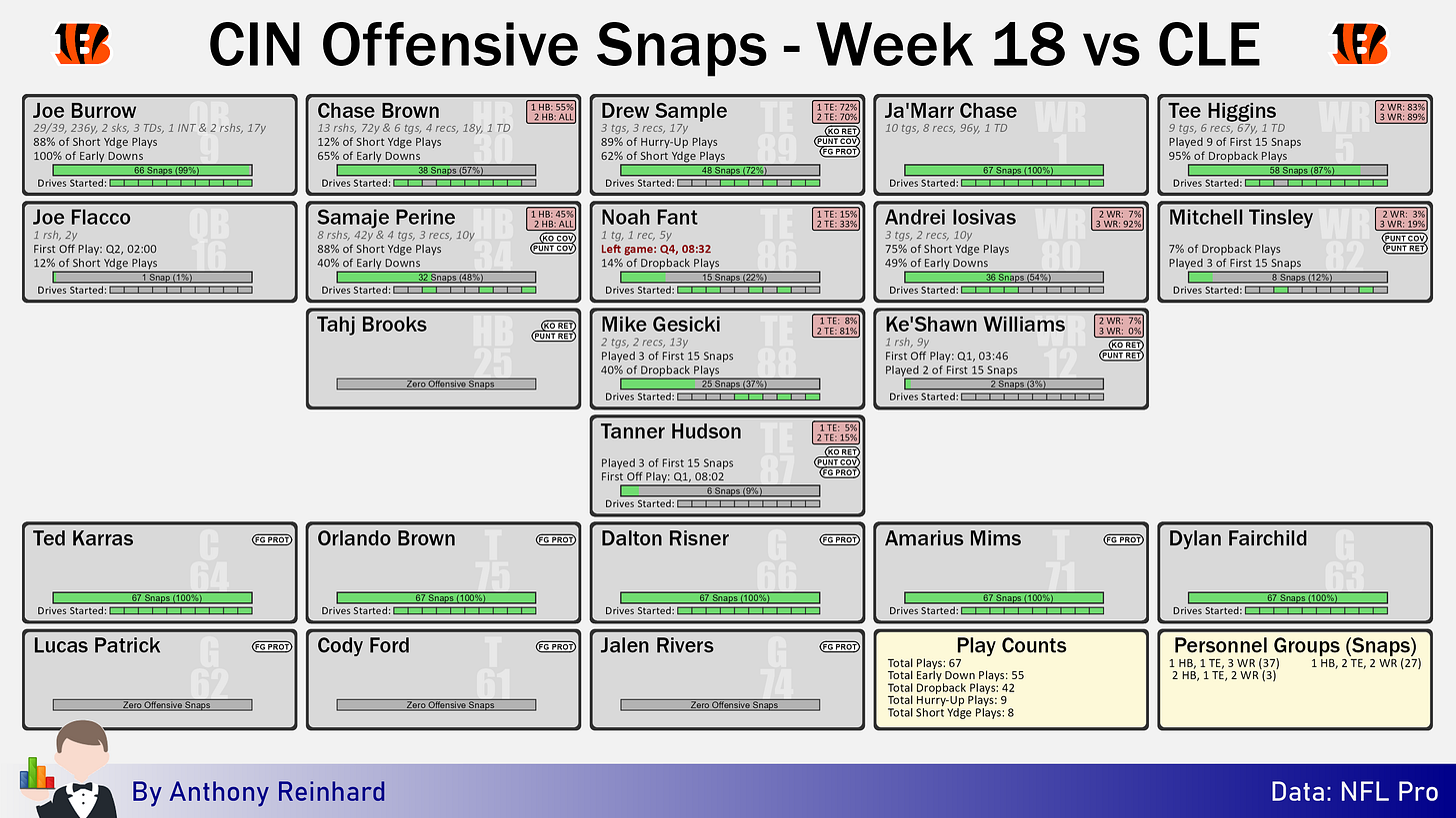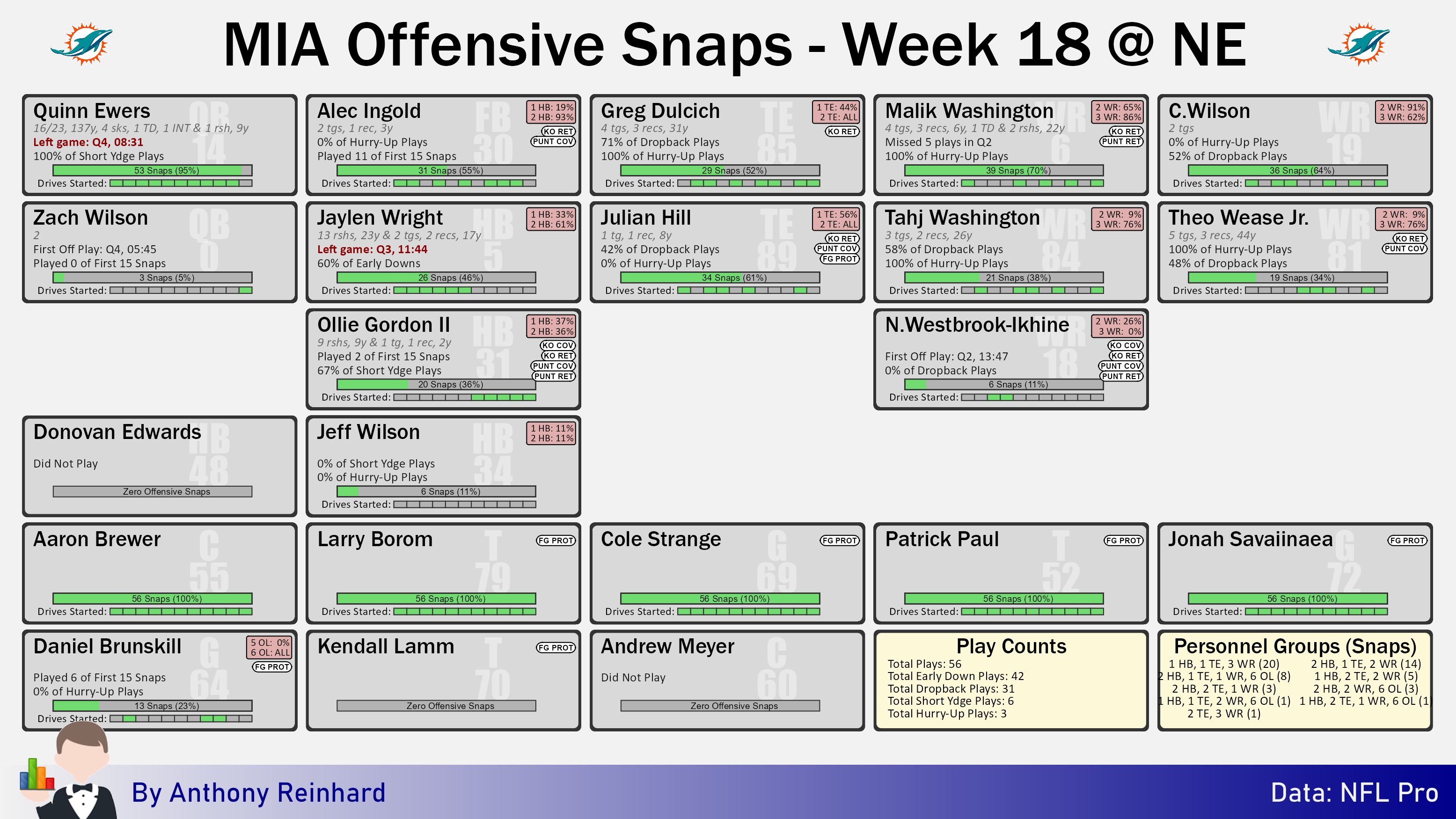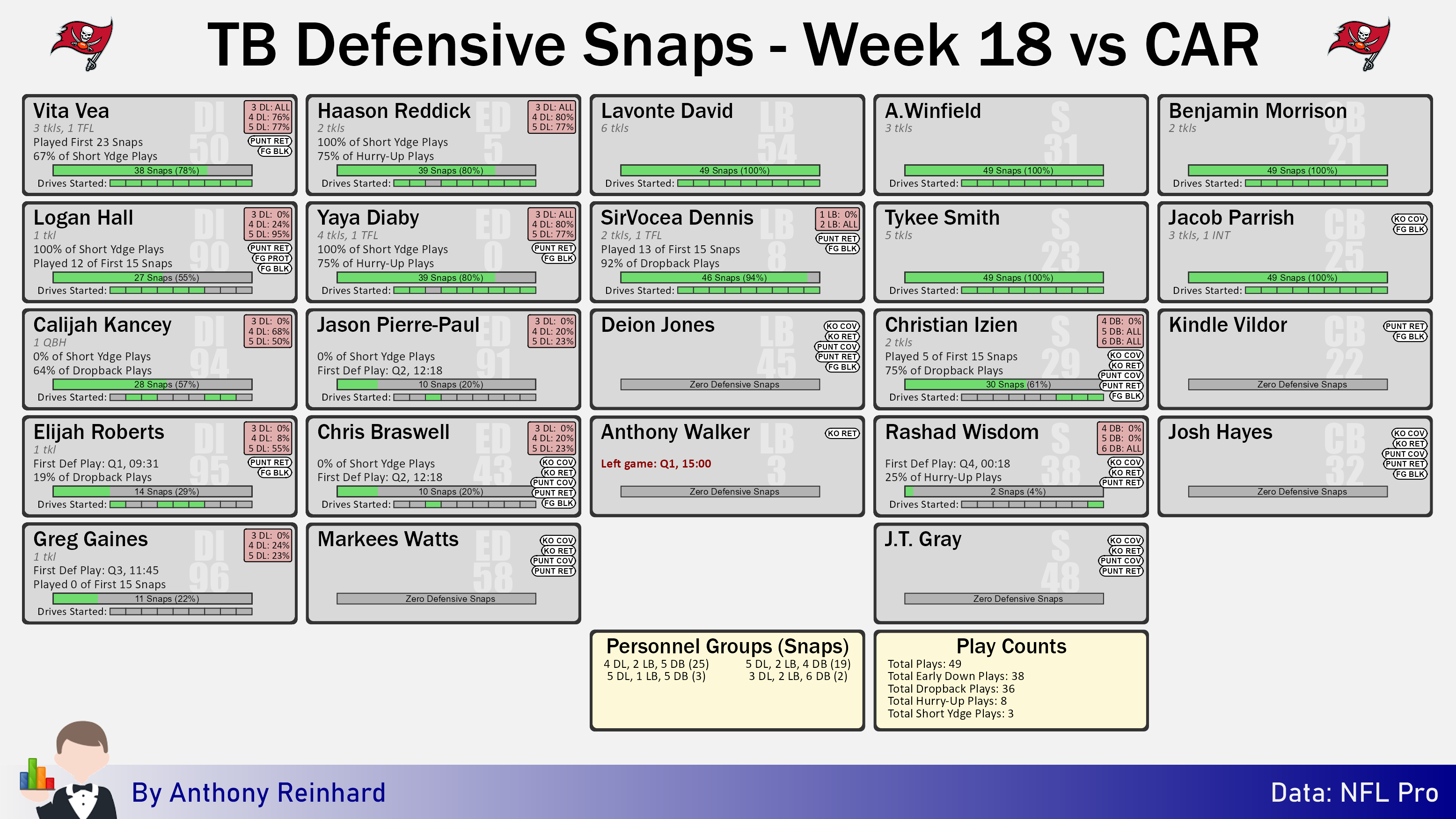 Snap Counts: Week 18Snap Count graphs for each team in Week 18Anthony ReinhardJan 05, 20261ShareCAR-TBSEA-SFNO-ATLCLE-CININD-HOUTEN-JAXGB-MINDAL-NYGNYJ-BUFDET-CHILAC-DENARI-LAKC-LVMIA-NEWAS-PHIBAL-PITSubscribePreviousNext
