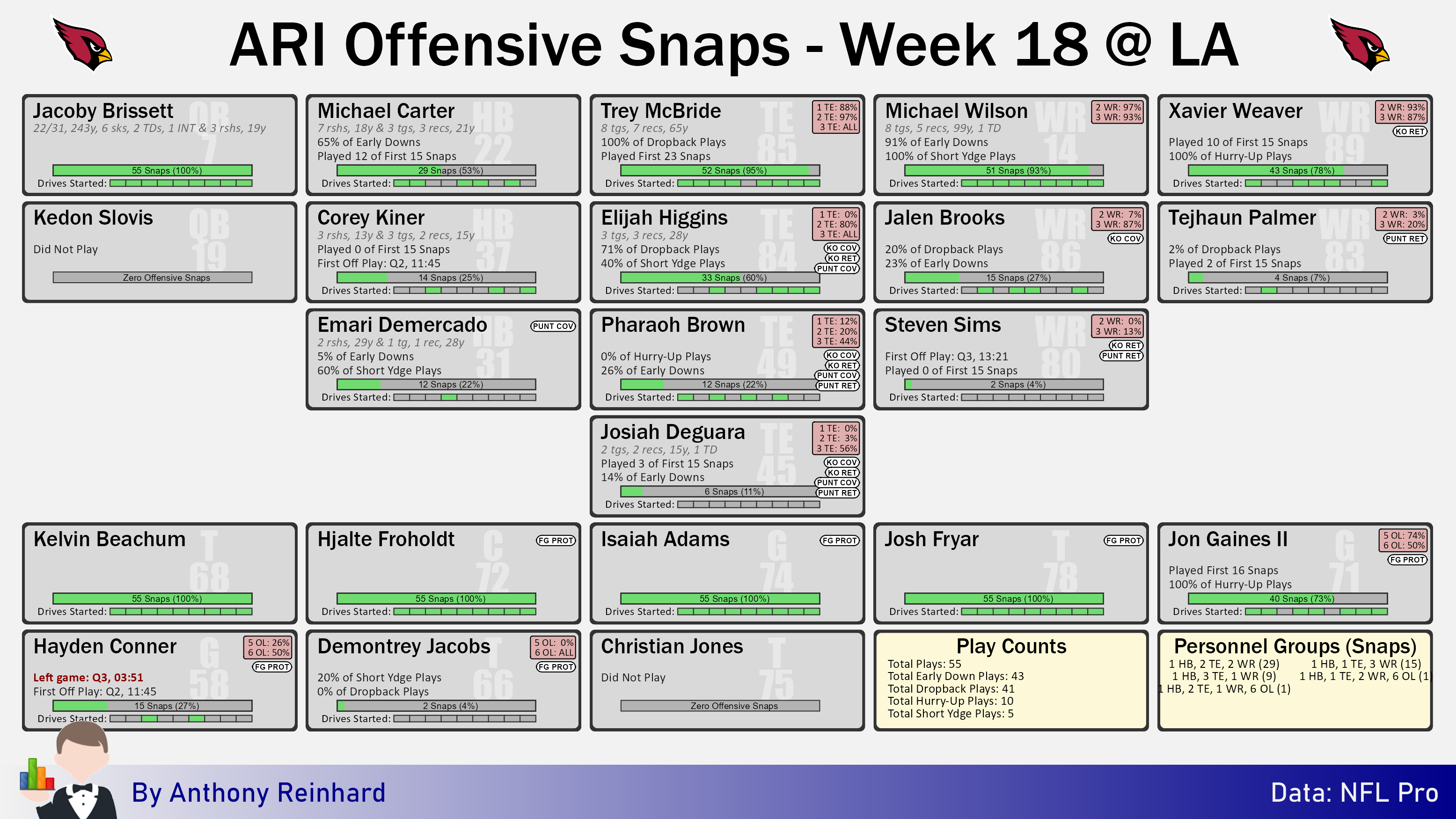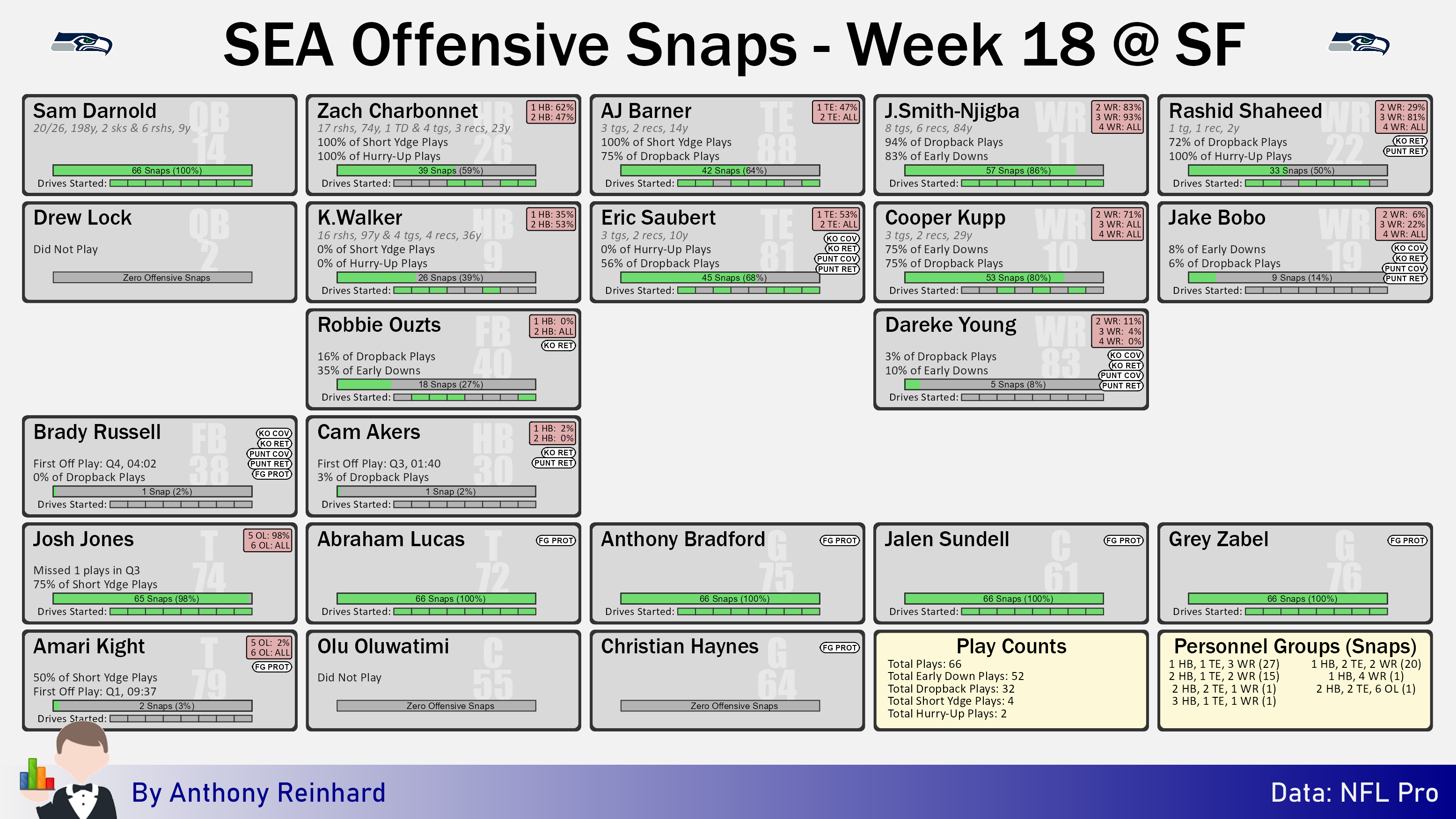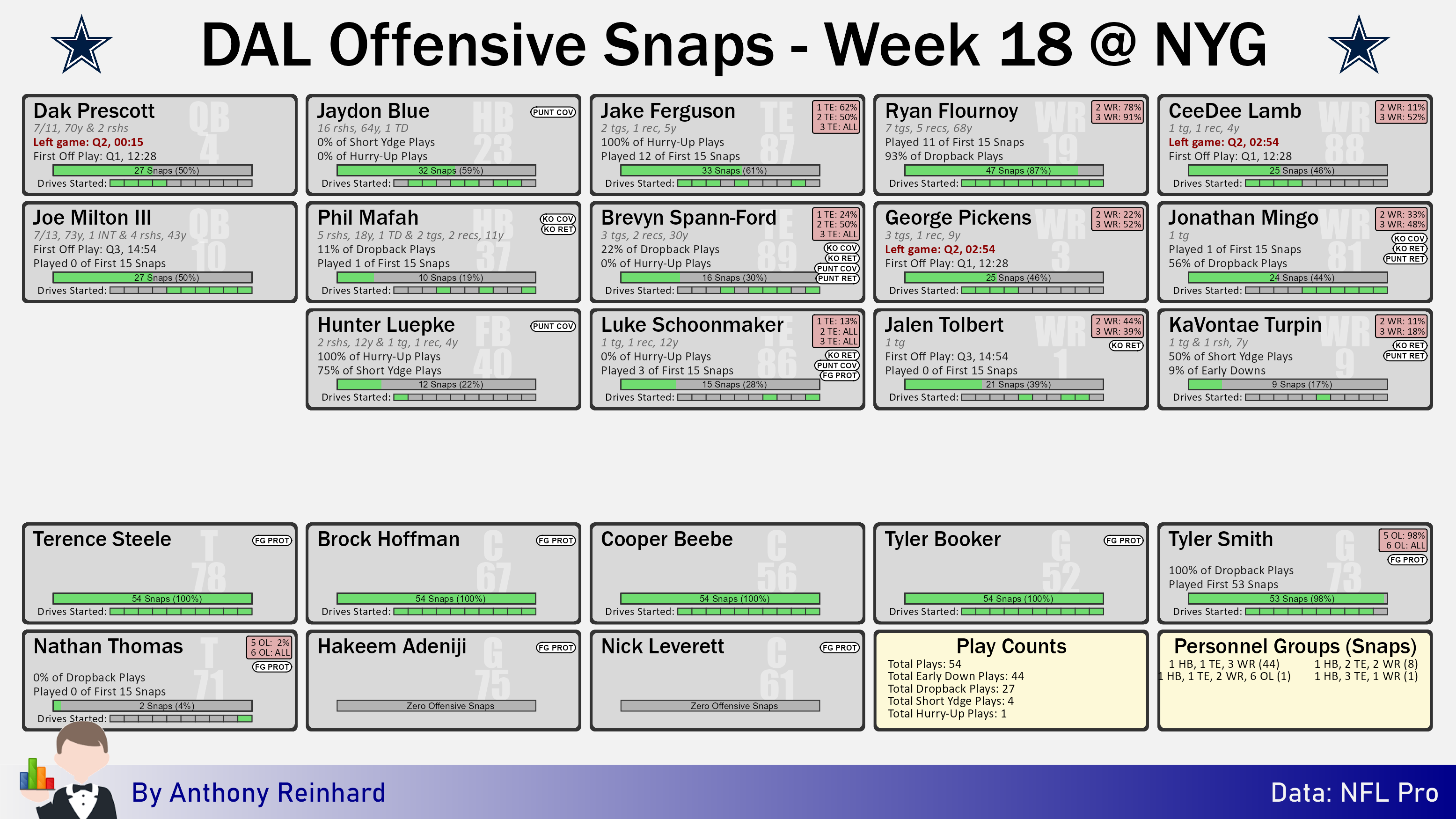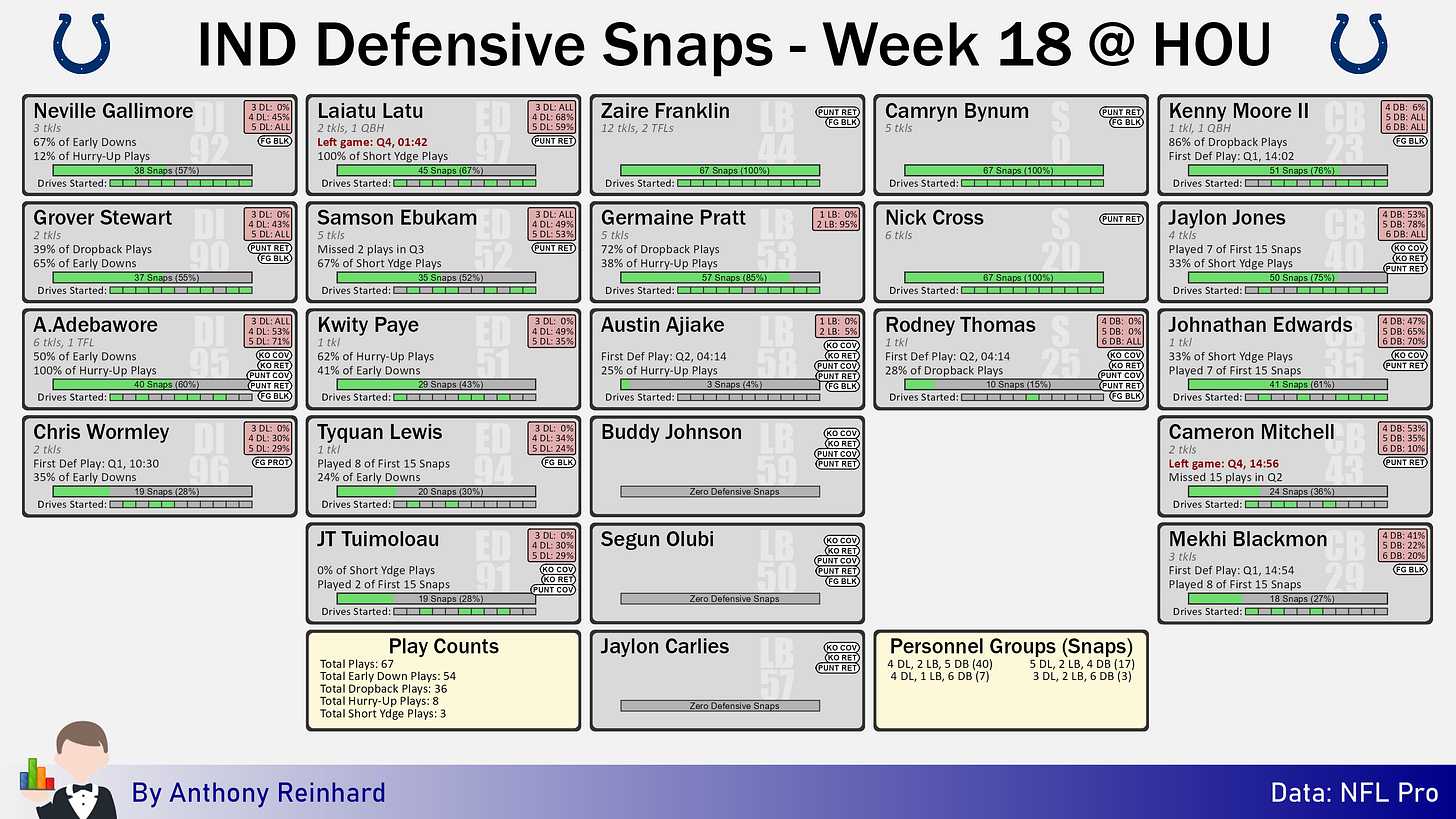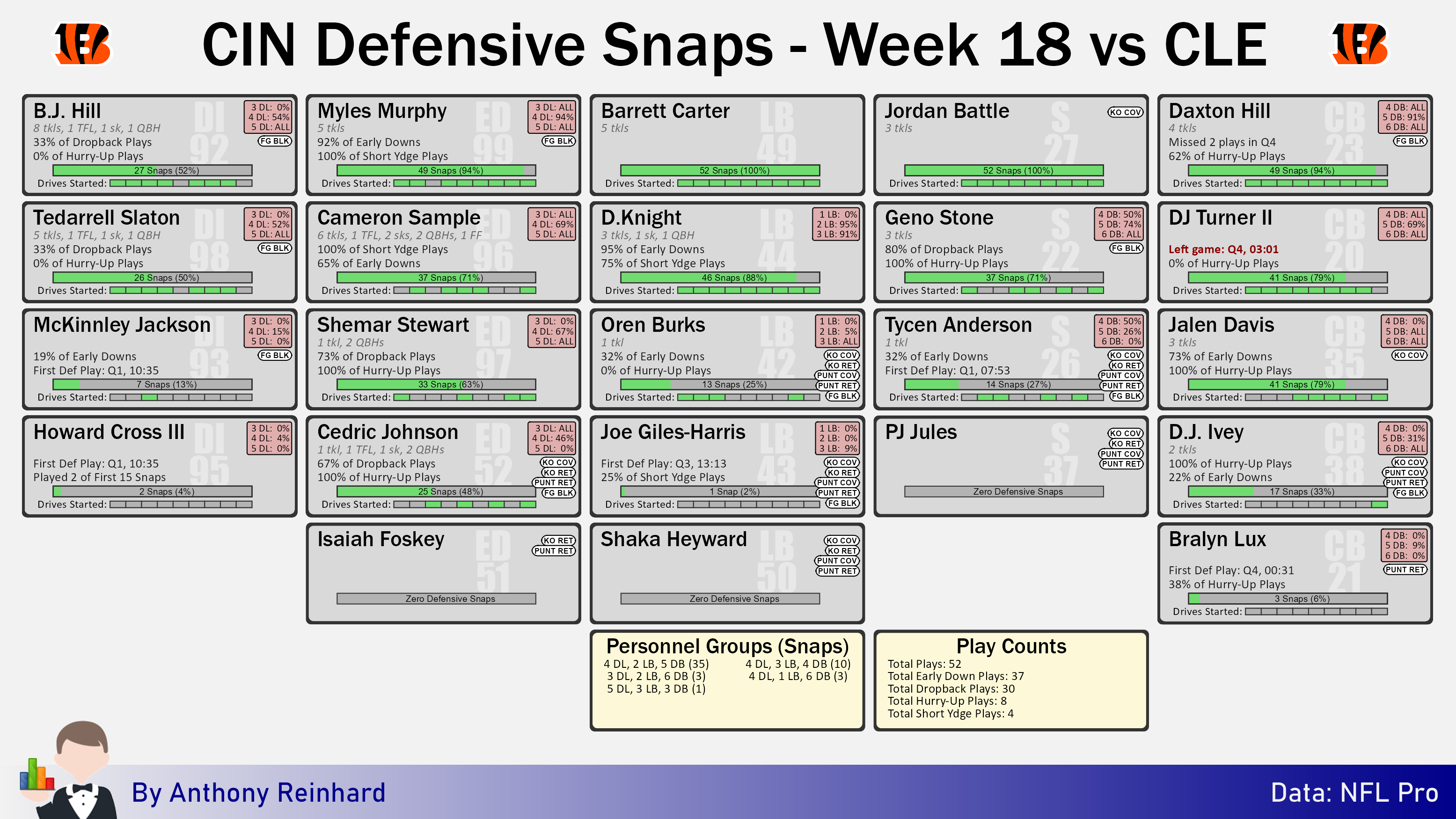 Snap Counts: Week 18Snap Count graphs for each team in Week 18Anthony ReinhardJan 05, 20261ShareCAR-TBSEA-SFNO-ATLCLE-CININD-HOUTEN-JAXGB-MINDAL-NYGNYJ-BUFDET-CHILAC-DENARI-LAKC-LVMIA-NEWAS-PHIBAL-PITSubscribePreviousNext