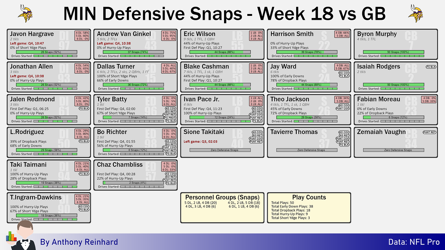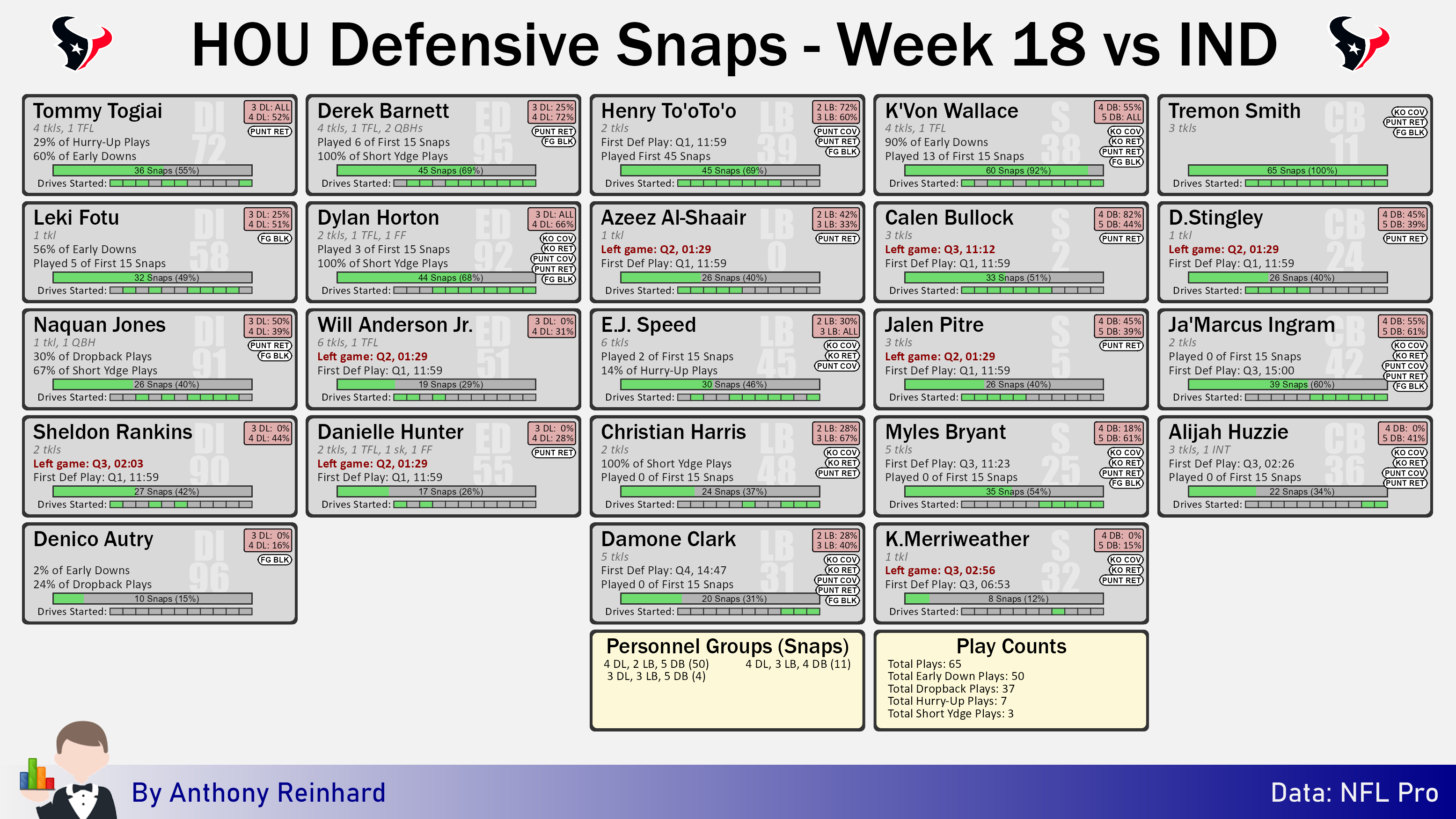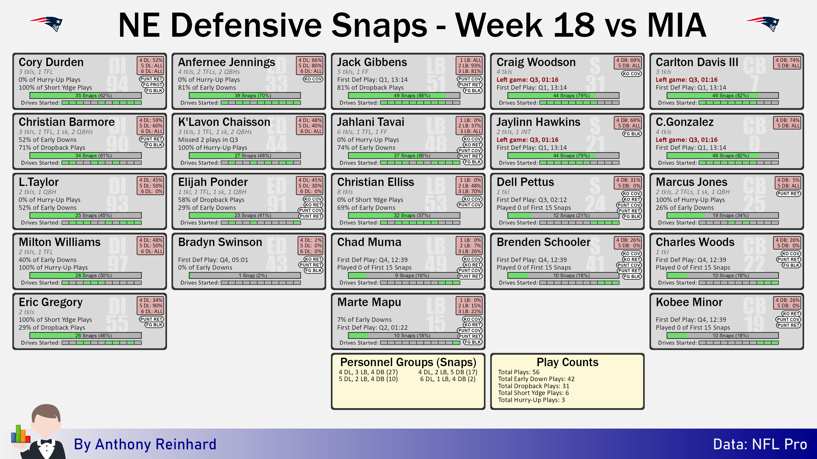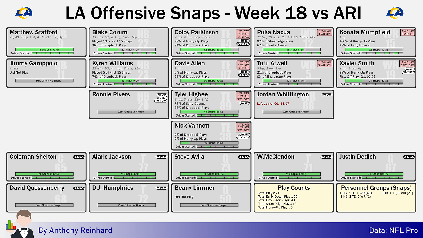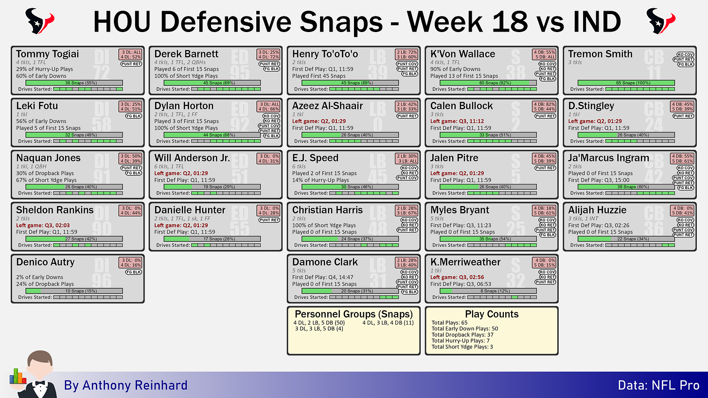 Snap Counts: Week 18Snap Count graphs for each team in Week 18Anthony ReinhardJan 05, 20261ShareCAR-TBSEA-SFNO-ATLCLE-CININD-HOUTEN-JAXGB-MINDAL-NYGNYJ-BUFDET-CHILAC-DENARI-LAKC-LVMIA-NEWAS-PHIBAL-PITSubscribePreviousNext