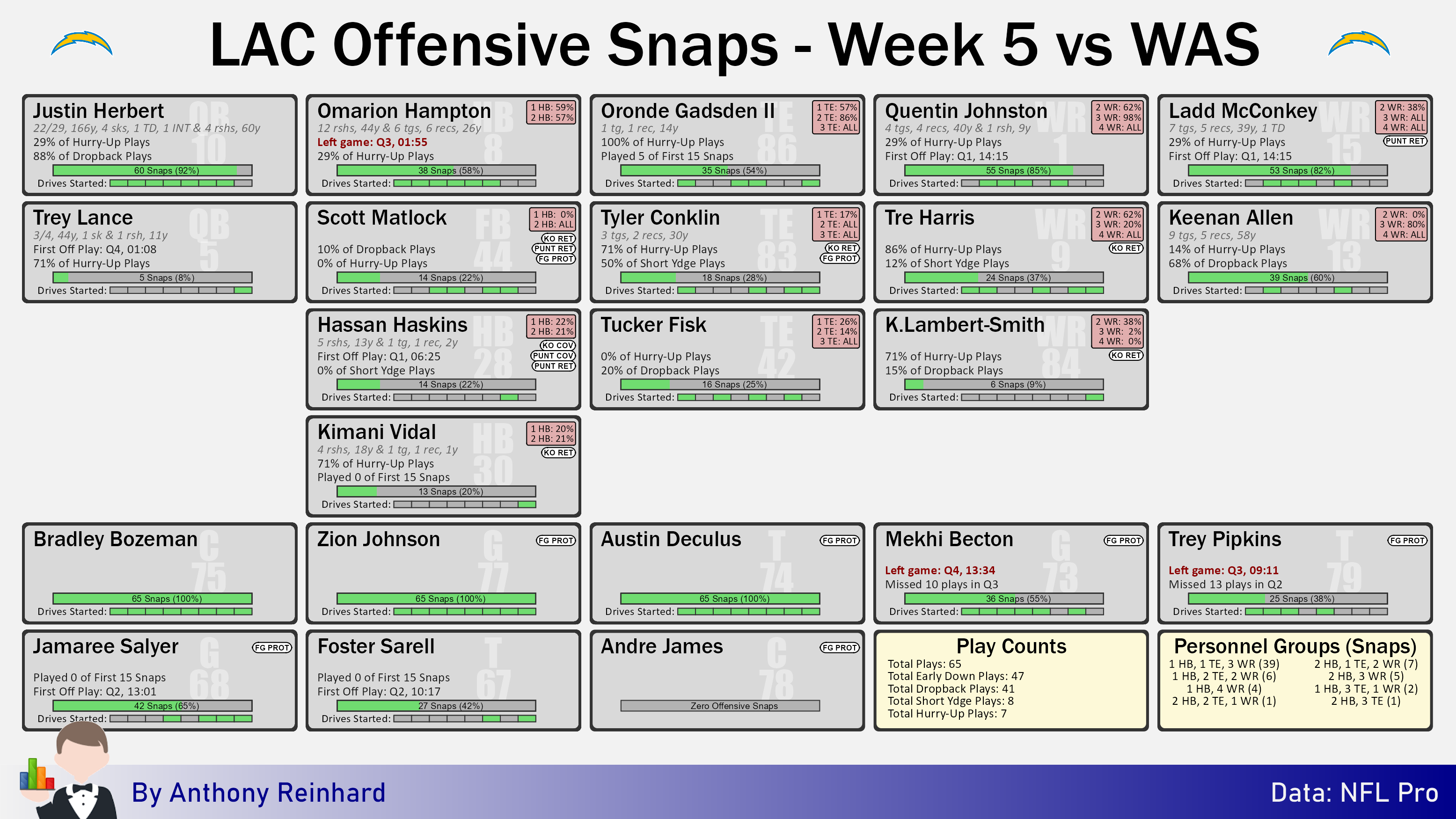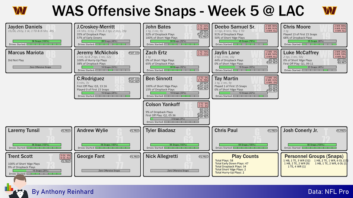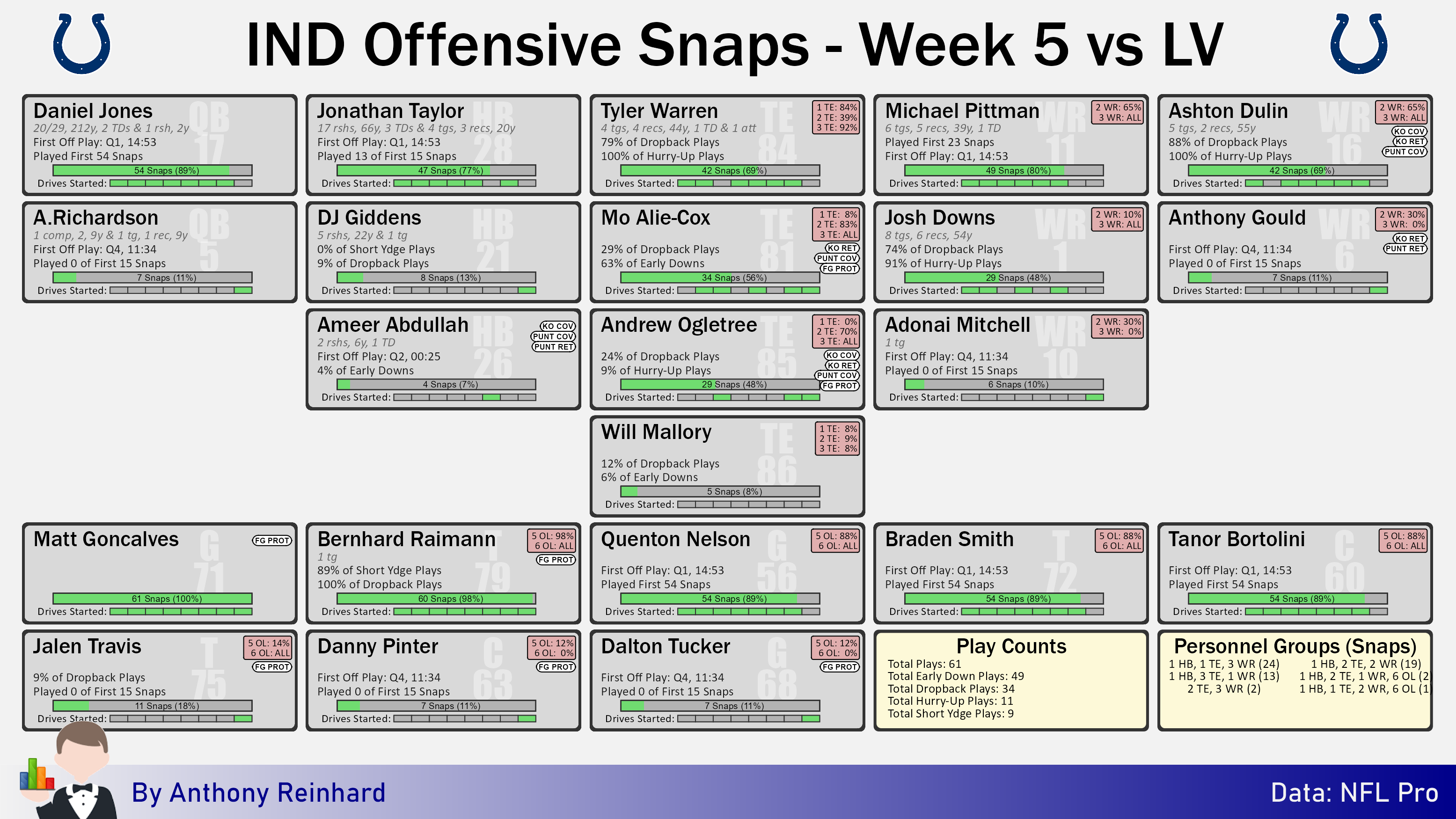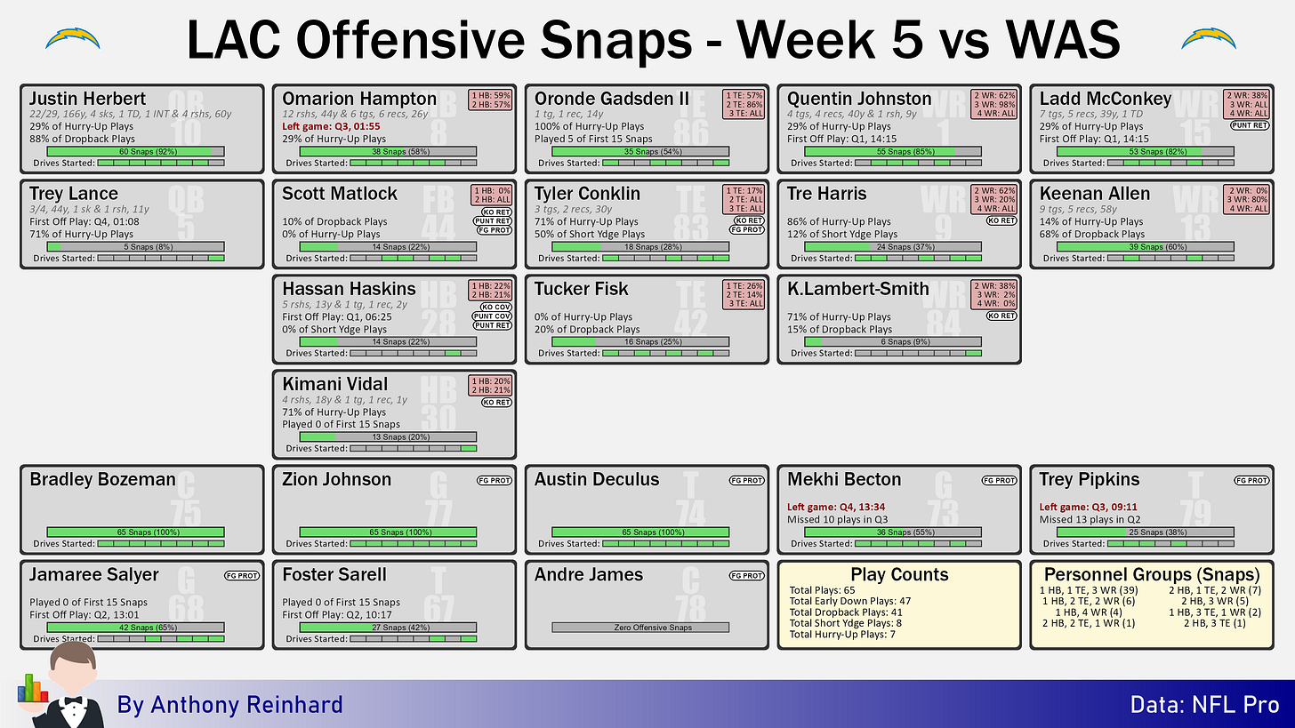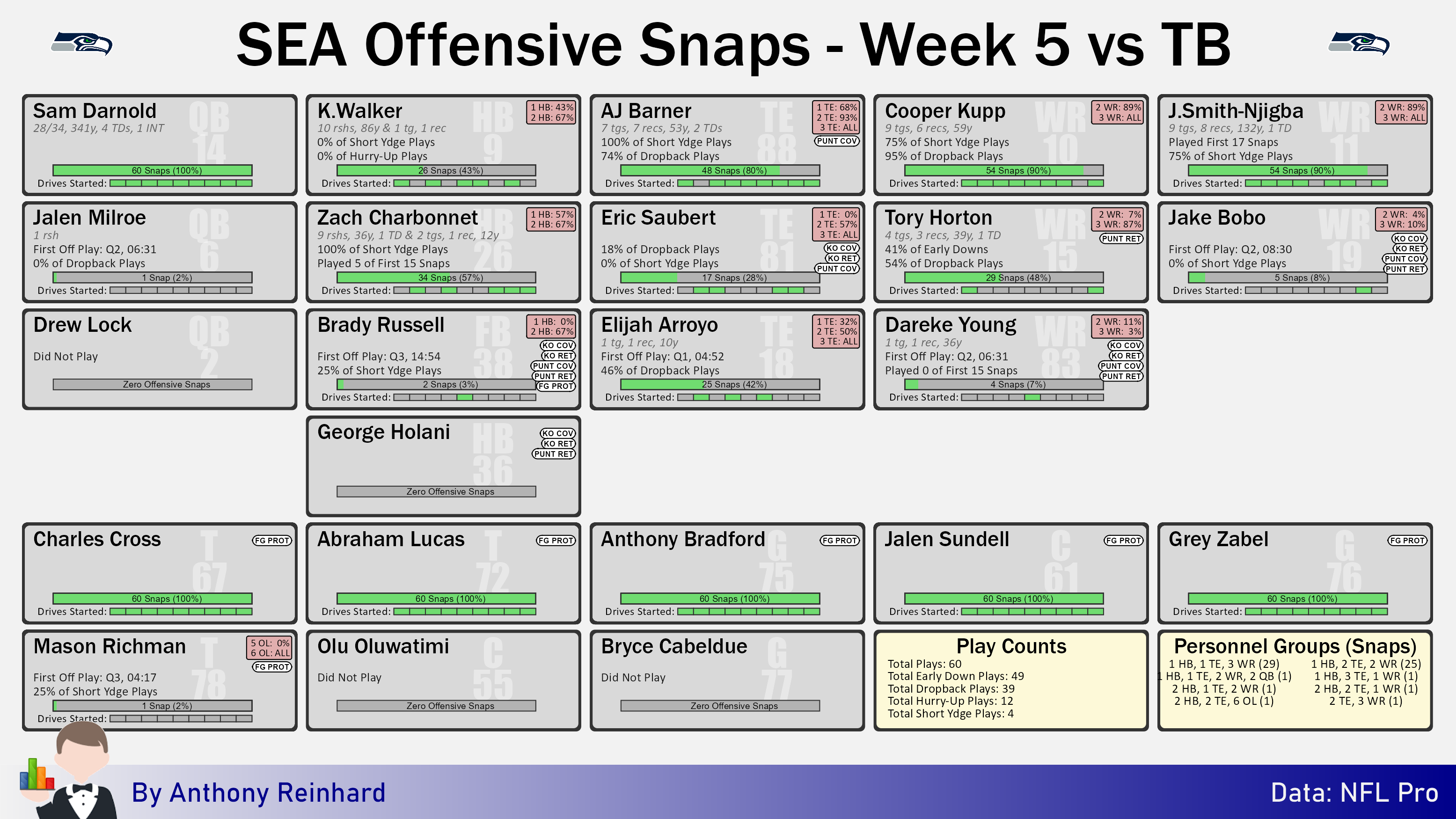 Snap Counts: Week 5Snap Count graphs for each team in Week 5Anthony ReinhardOct 06, 202511ShareThanks for reading!SubscribeSF-LAMIN-CLEHOU-BALMIA-CARLV-INDNYG-NODAL-NYJDEN-PHITEN-ARITB-SEADET-CINWAS-LACNE-BUFComing Soon!KC-JAXComing Soon!Previous