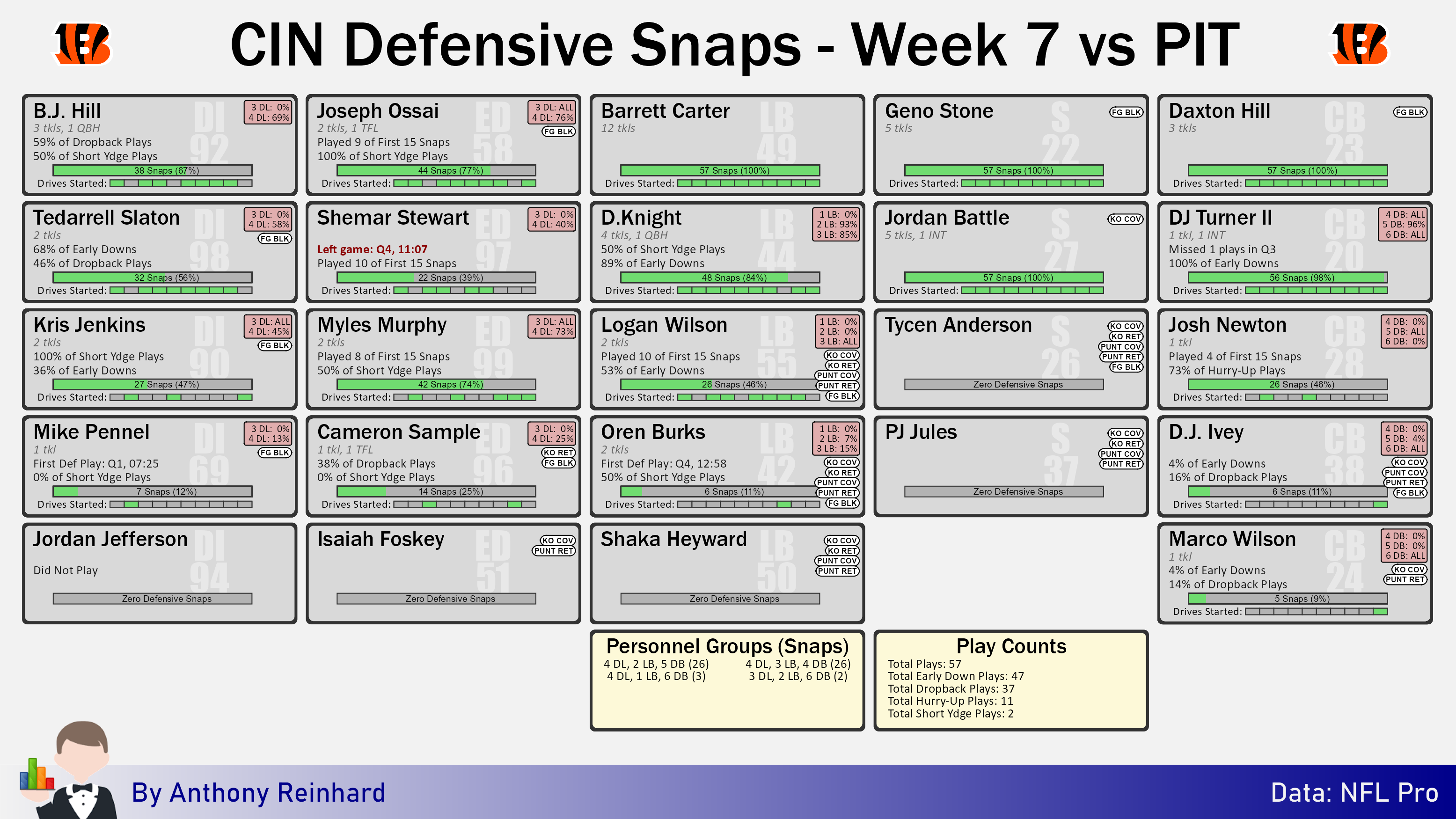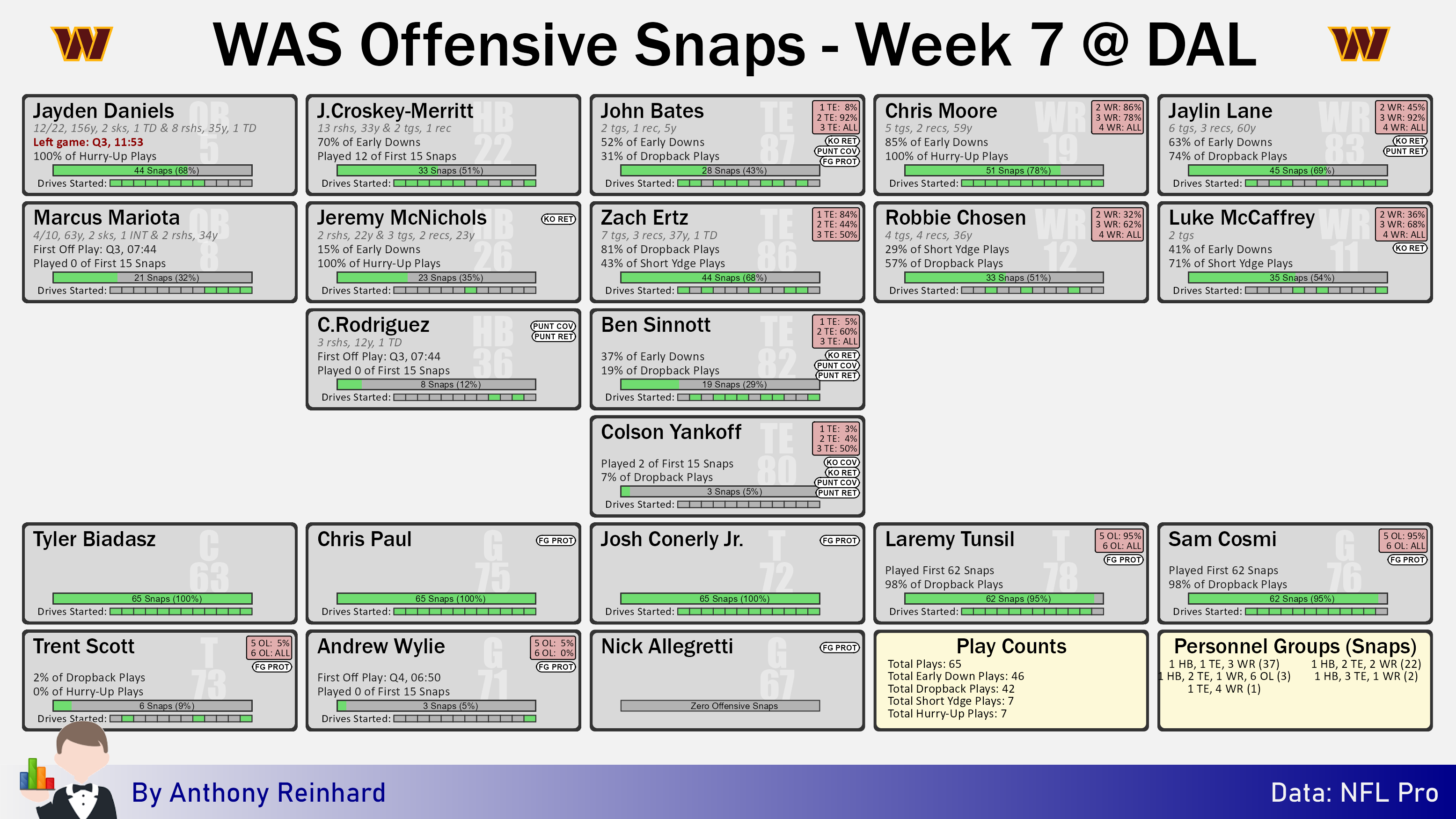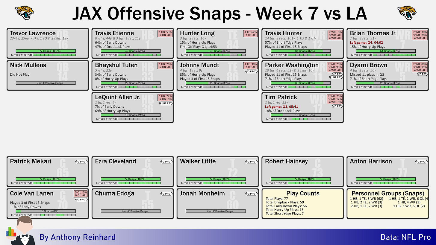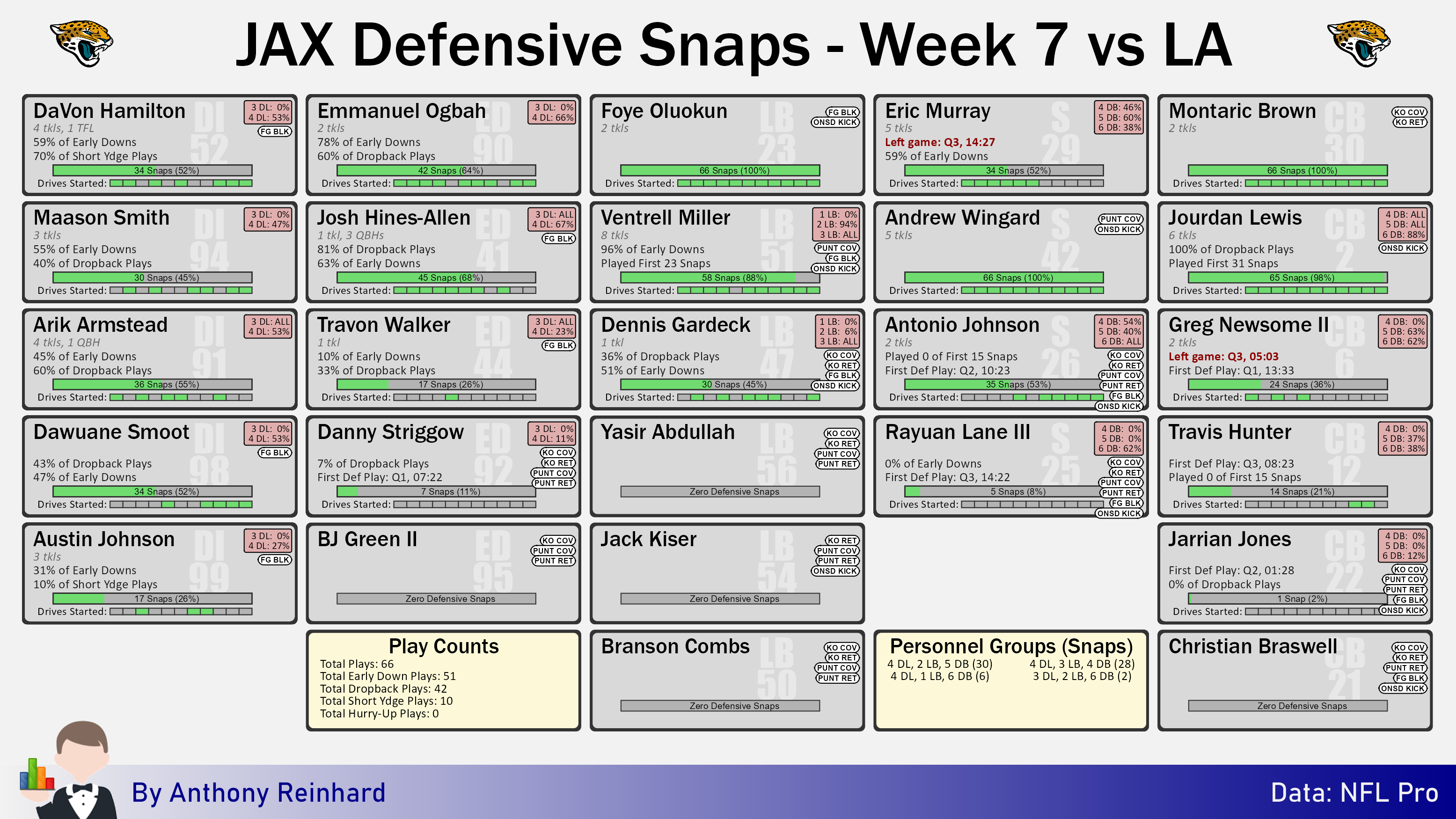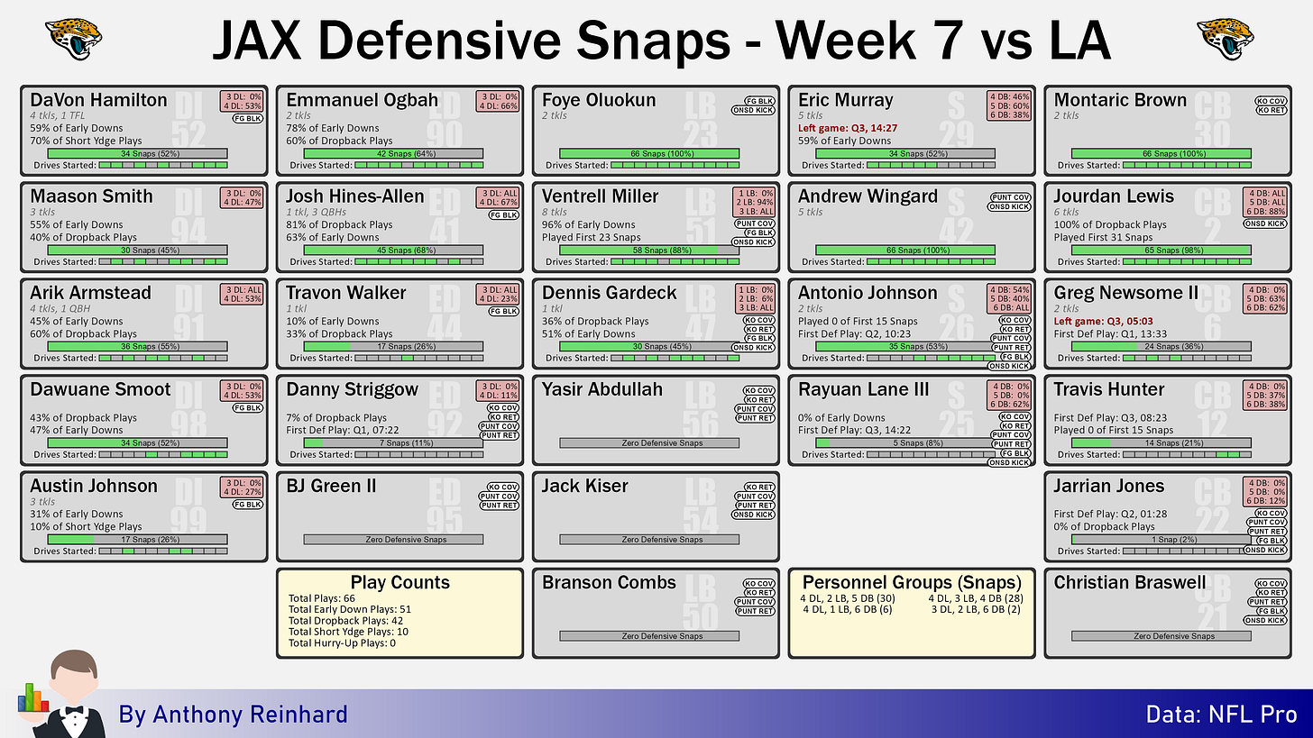 Snap Counts: Week 7Snap Count graphs for each team in Week 7Anthony ReinhardOct 20, 20251SharePIT-CINLA-JAXNO-CHIMIA-CLELV-KCPHI-MINCAR-NYJNE-TENNYG-DENIND-LACGB-ARIWAS-DALATL-SFTB-DETHOU-SEAThanks for reading!SubscribePreviousNext