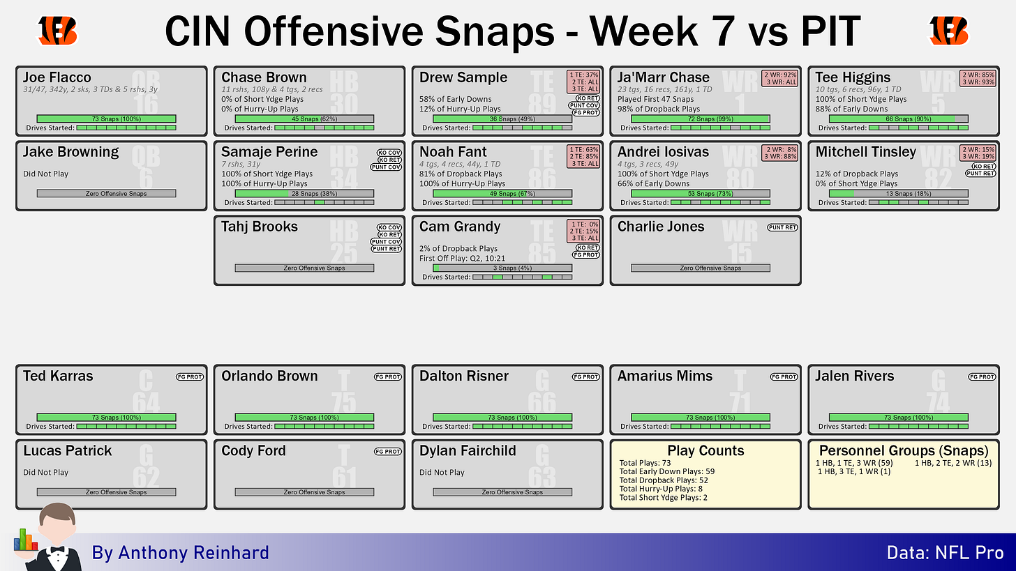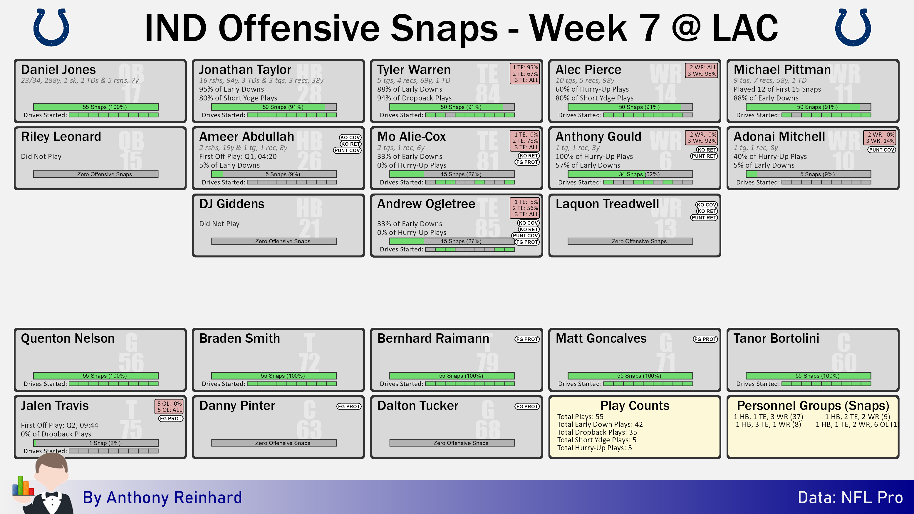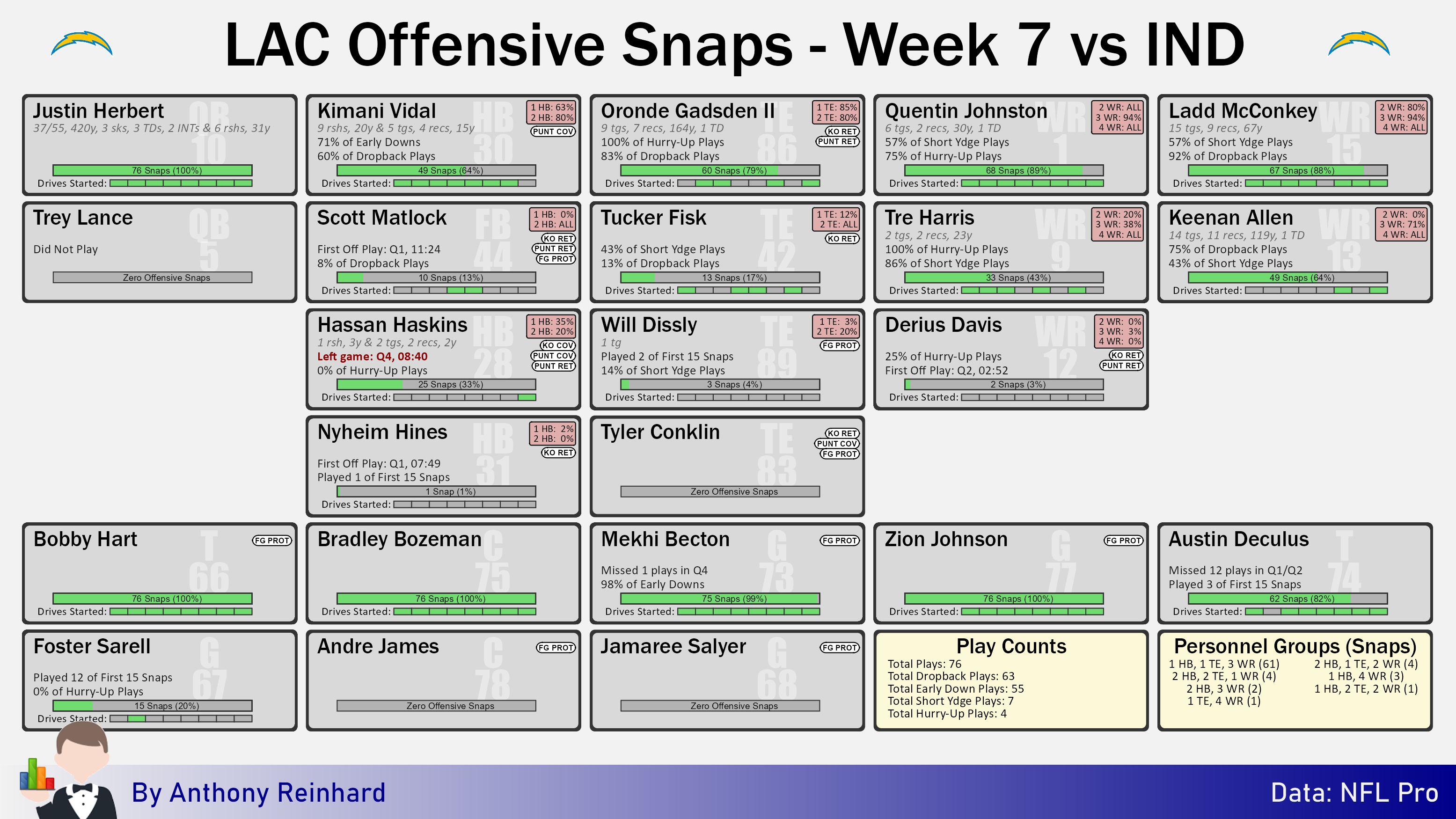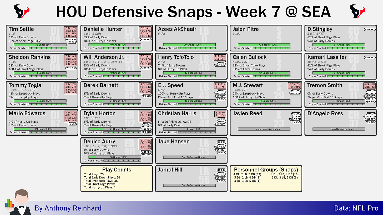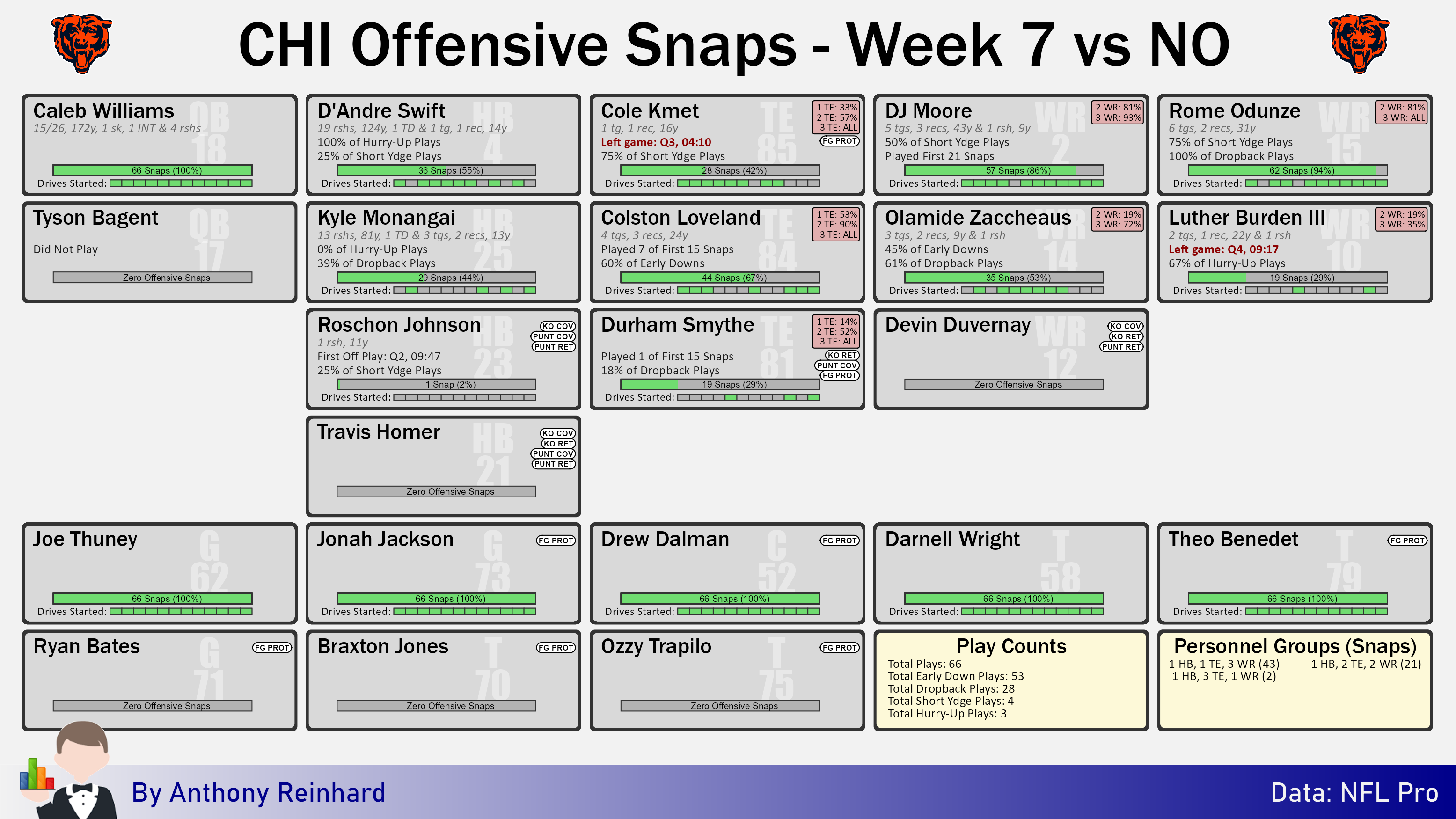 Snap Counts: Week 7Snap Count graphs for each team in Week 7Anthony ReinhardOct 20, 20251SharePIT-CINLA-JAXNO-CHIMIA-CLELV-KCPHI-MINCAR-NYJNE-TENNYG-DENIND-LACGB-ARIWAS-DALATL-SFTB-DETHOU-SEAThanks for reading!SubscribePreviousNext