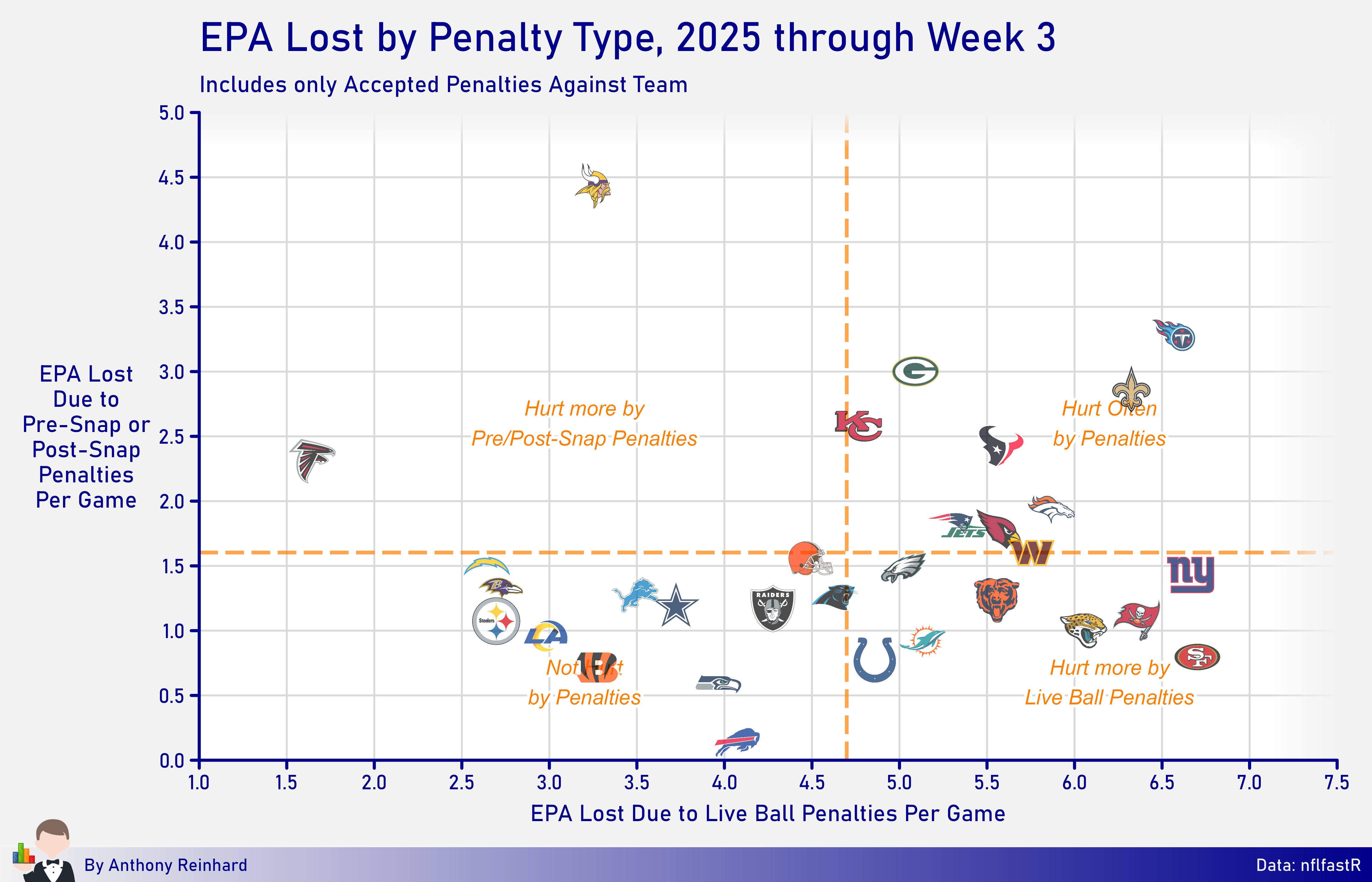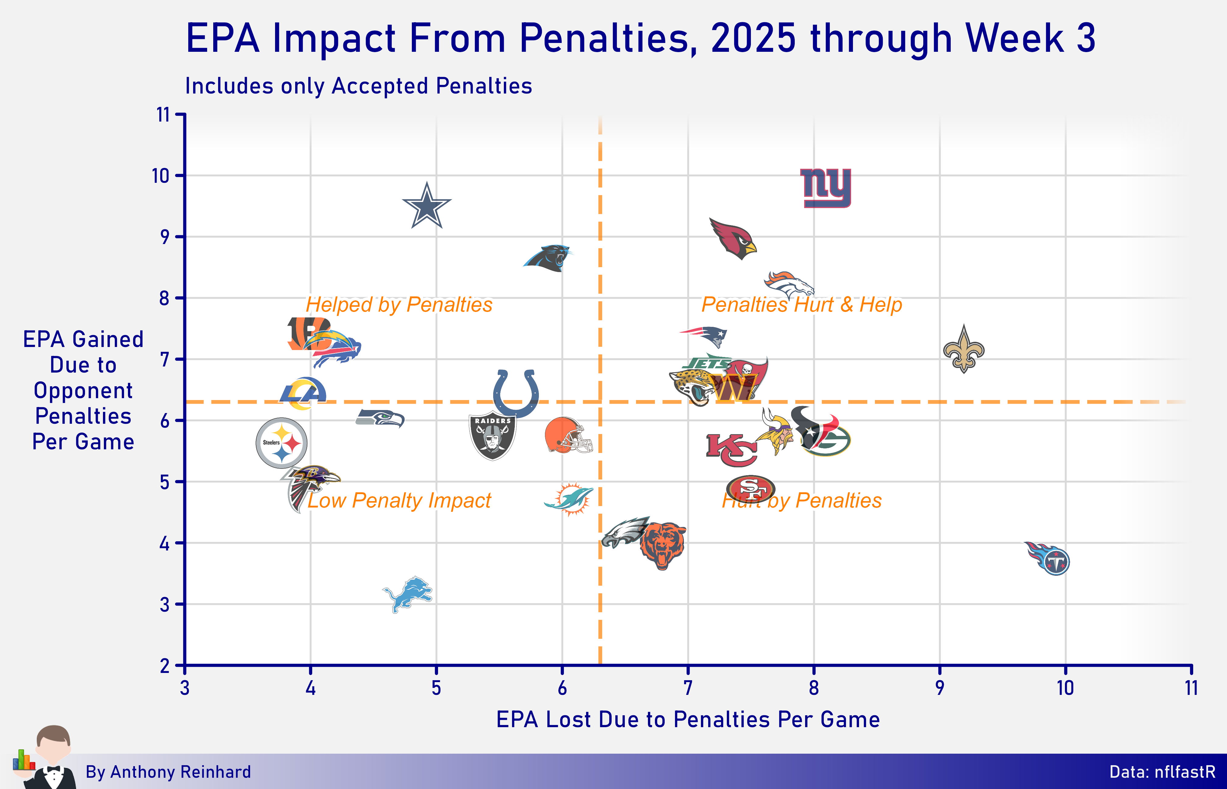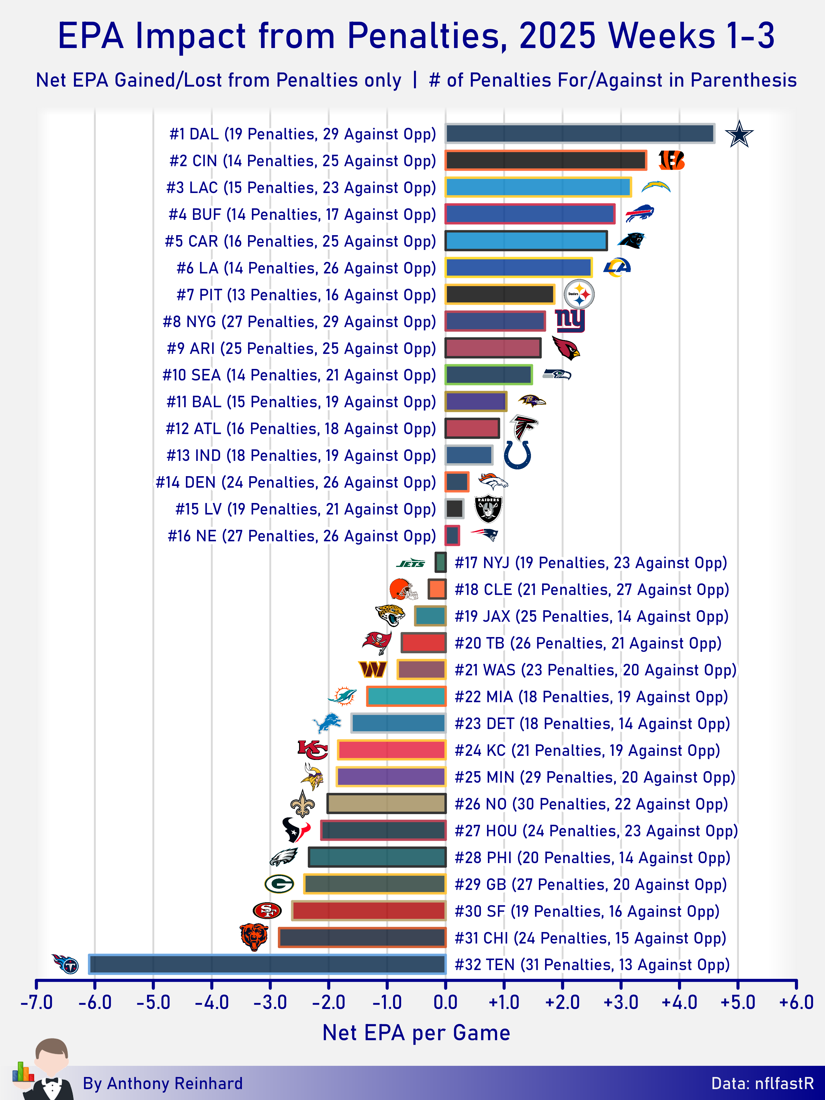 This graph shows net Expected Points Added from accepted penalties. The Cowboys are the league’s biggest beneficiaries, while the Titans are giving up nearly a full touchdown per game on flags alone through three games.