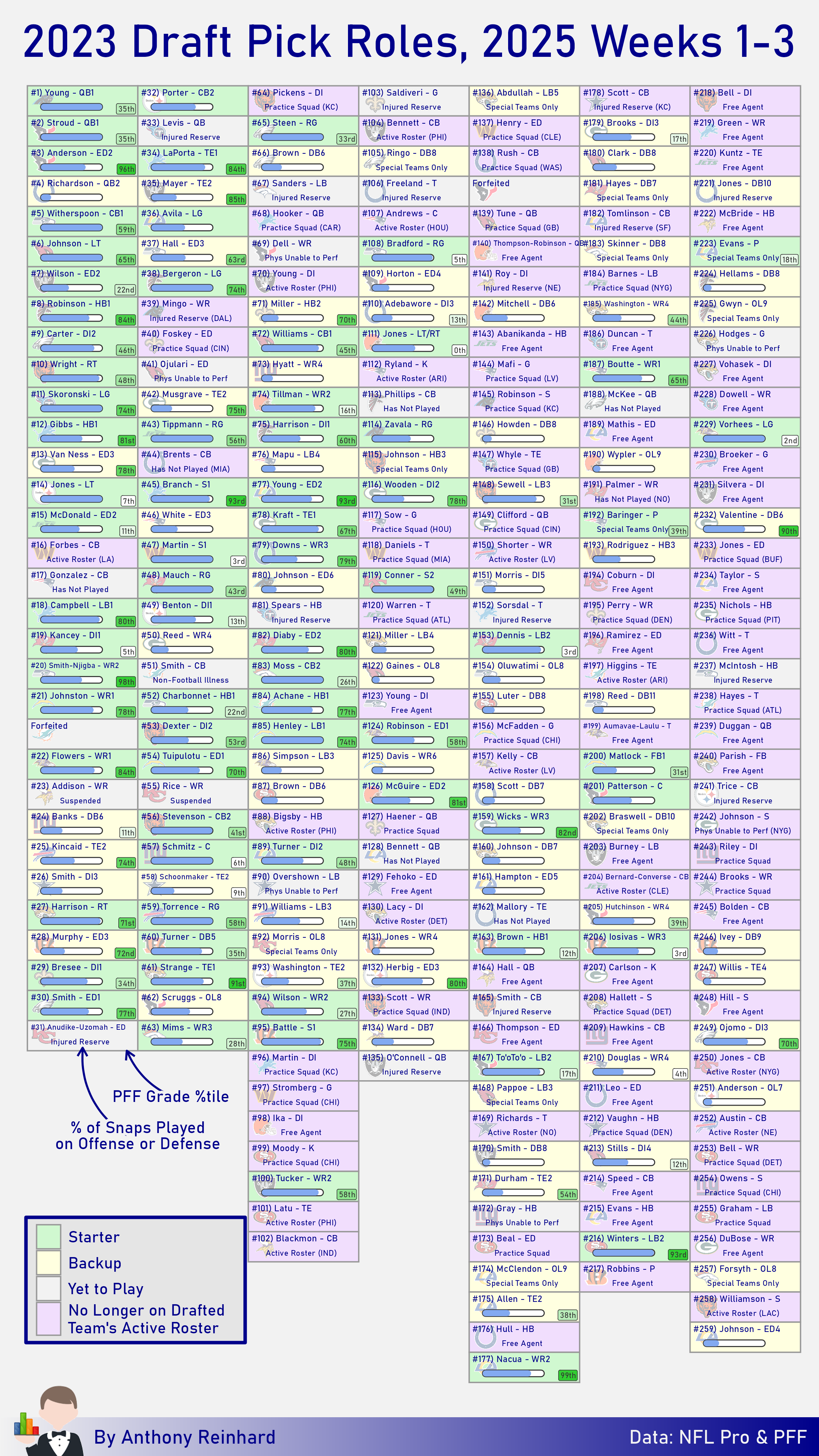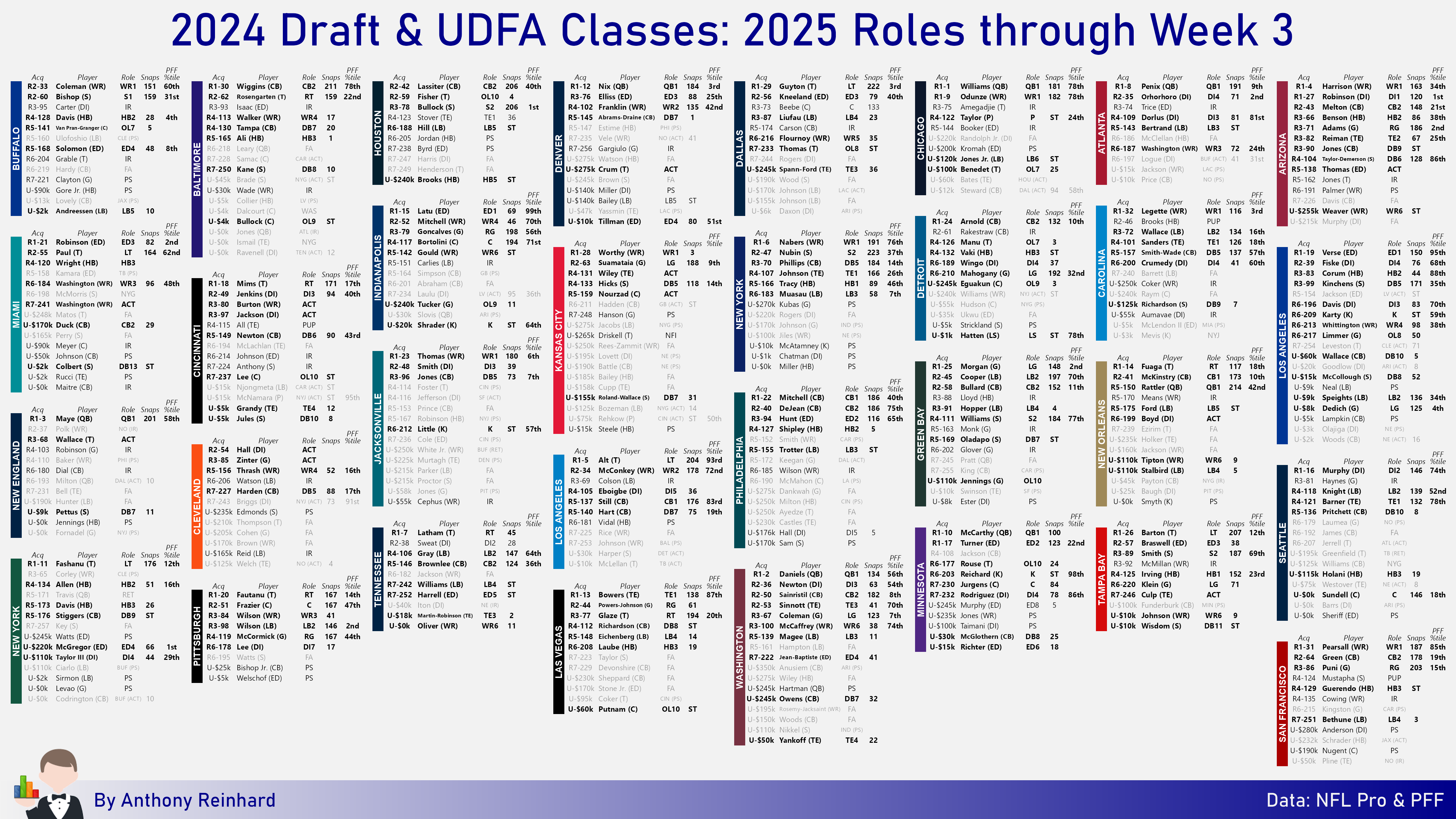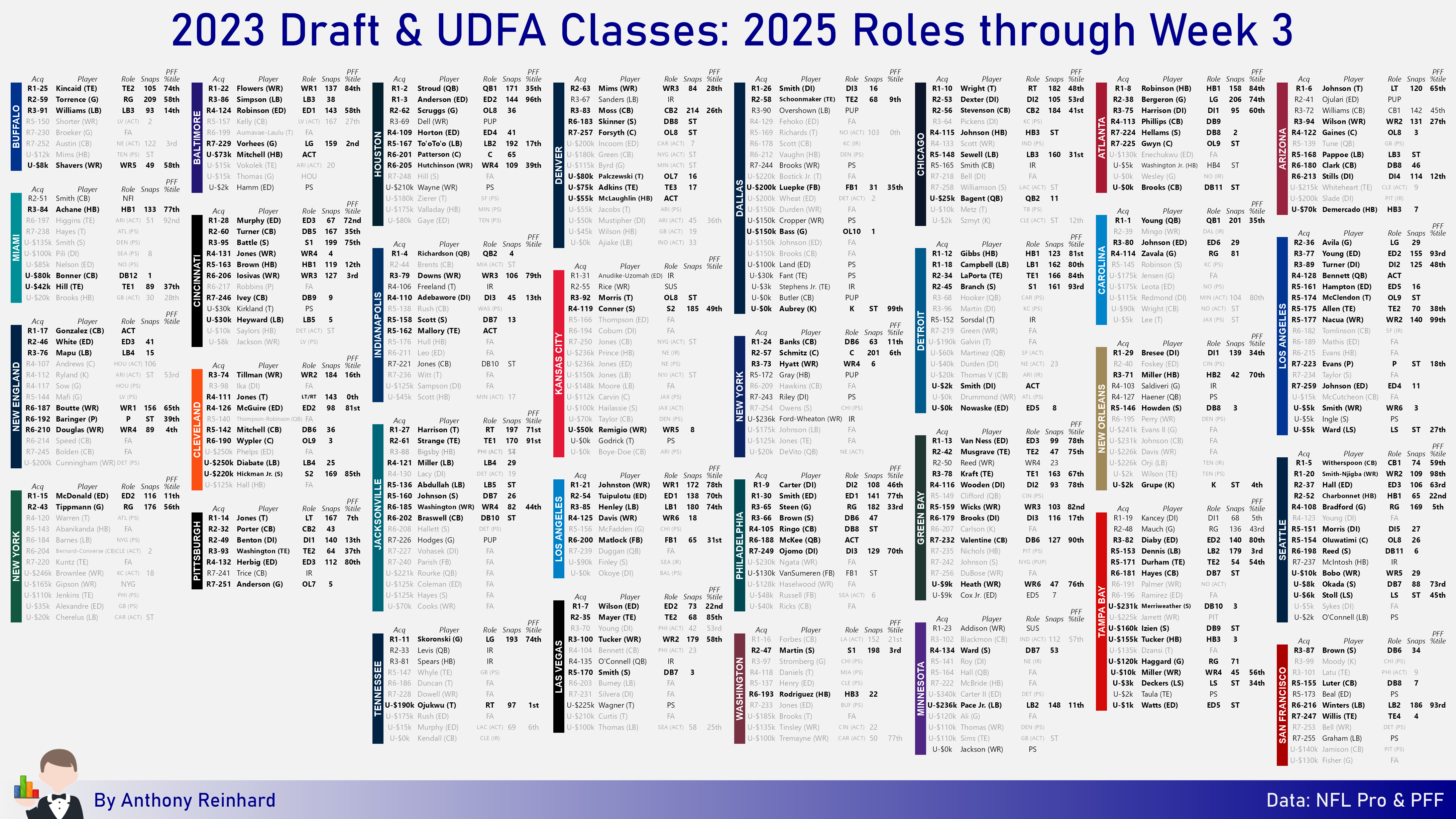 These have been popular on social media when I shared them, so they’ll likely be a fixture of this weekly post. I’ve been sharing just the 2025 classes so far, but I’m going to share roles for the 2023 & 2024 classes on here. For those classes, I’m only showing their roles/grades/snaps from the 2025 season.