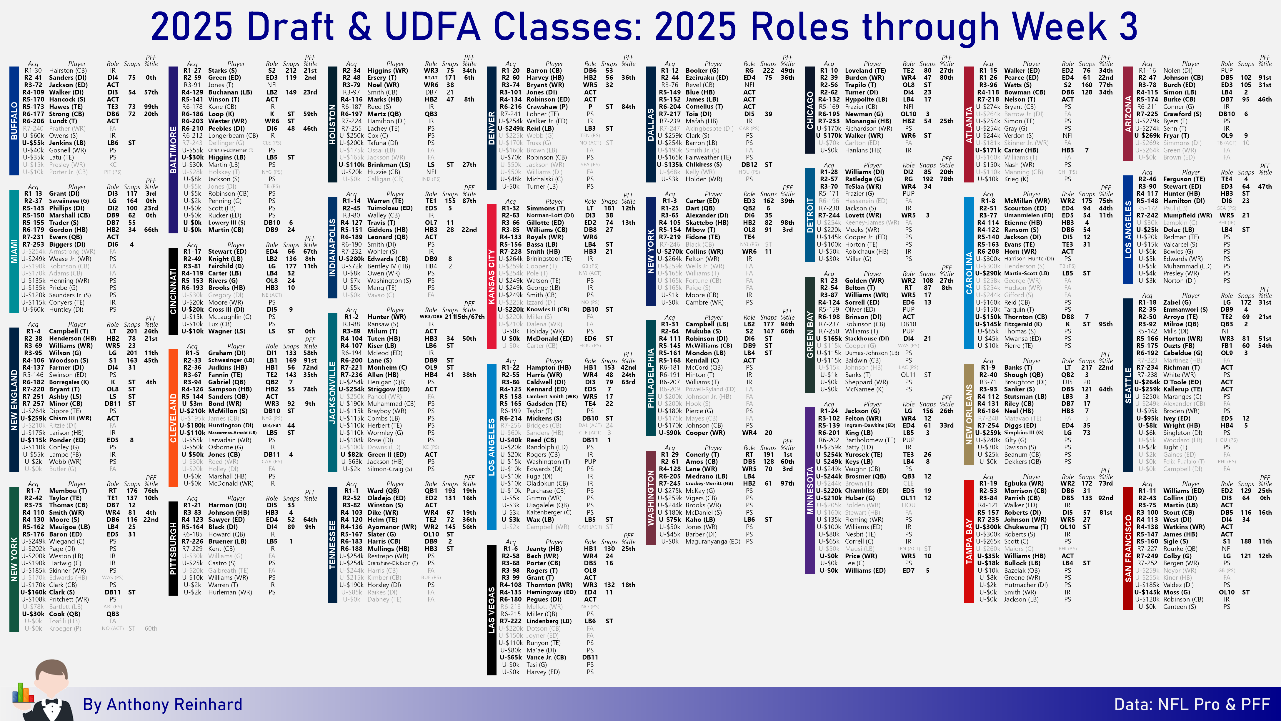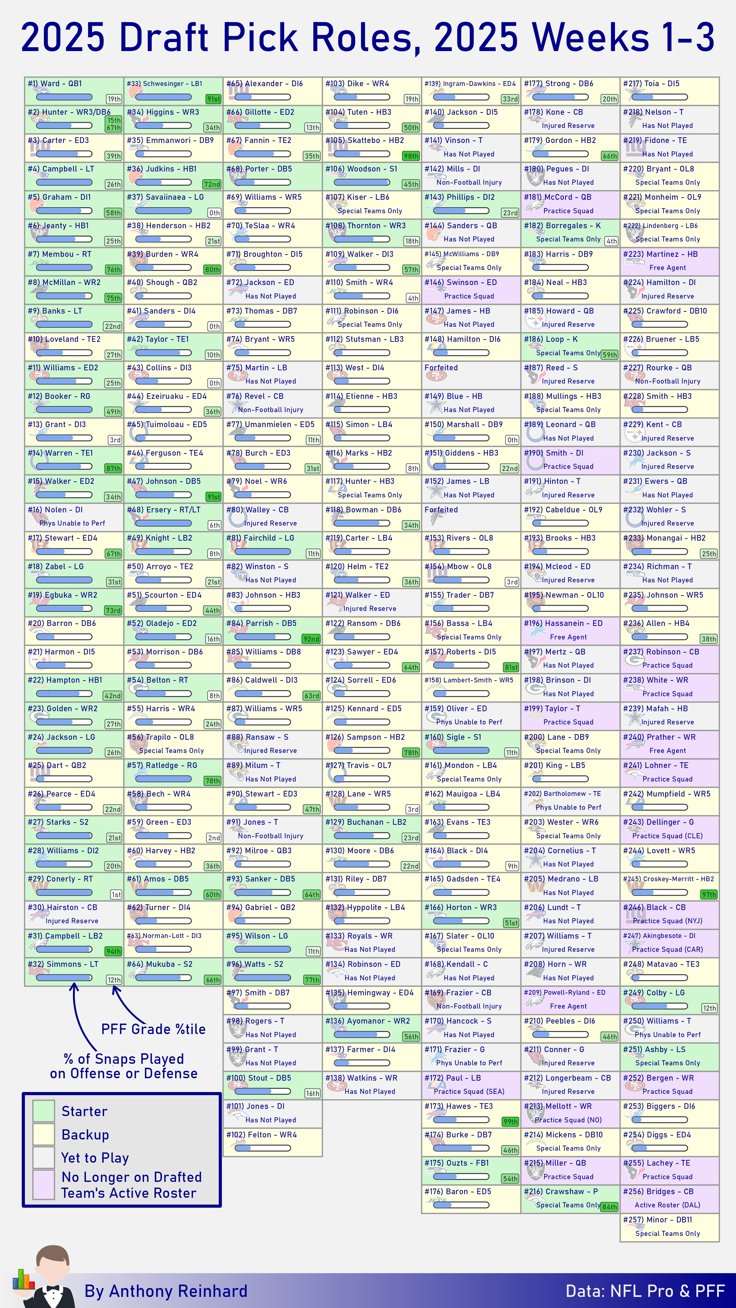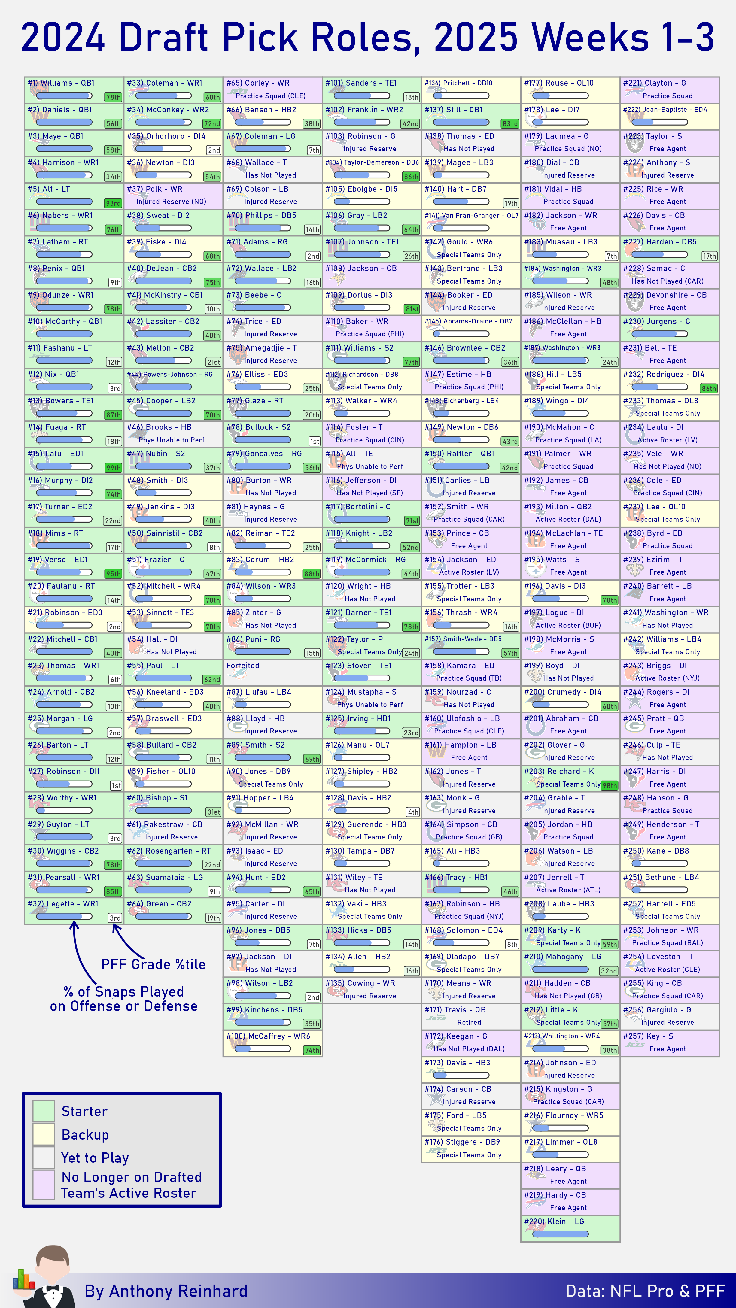 These have been popular on social media when I shared them, so they’ll likely be a fixture of this weekly post. I’ve been sharing just the 2025 classes so far, but I’m going to share roles for the 2023 & 2024 classes on here. For those classes, I’m only showing their roles/grades/snaps from the 2025 season.