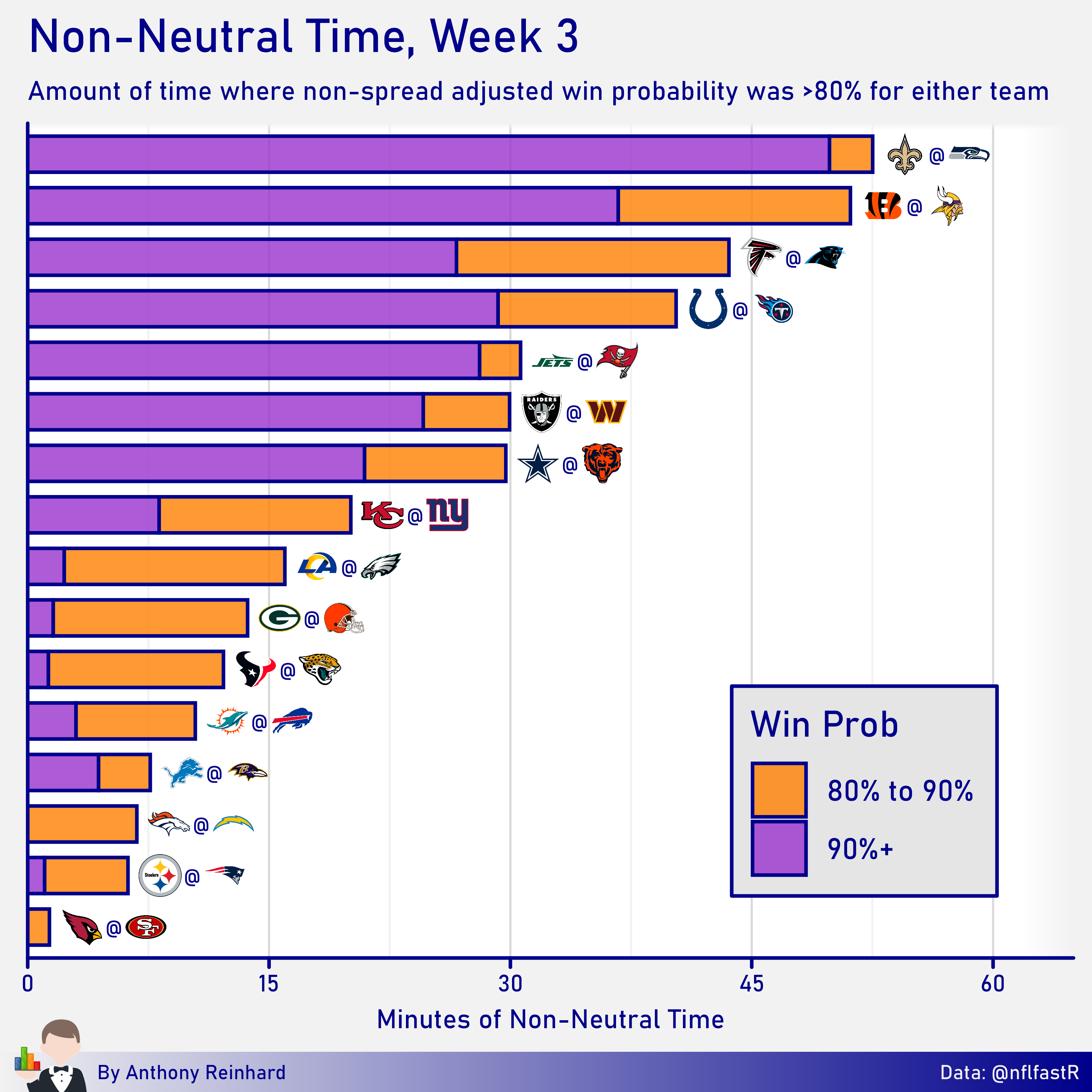 I’ve been sharing this one for years. Simply gives a sense of how much time each game spent where either team had a high win probability. It can show us huge blowouts (NO-SEA or CIN-MIN), but also where a team wrestles back into the game after mostly playing from behind (NYJ-TB).