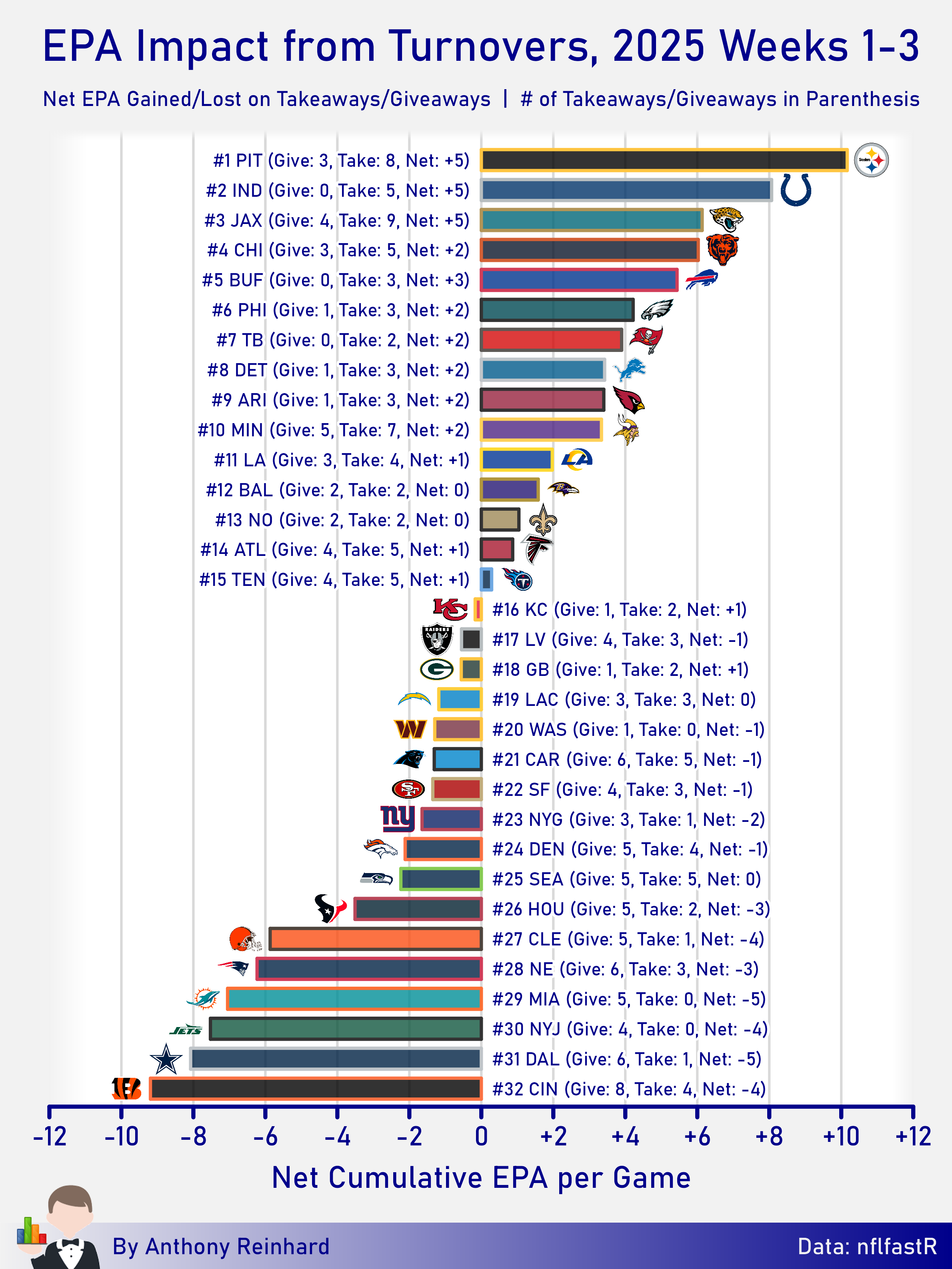 The Bengals were crushed by turnovers in their Week 3 loss in Minnesota in Jake Browning’s first start, giving them the league’s worth EPA turnover differential. The Colts are yet to commit a turnover in the Daniel Jones era.