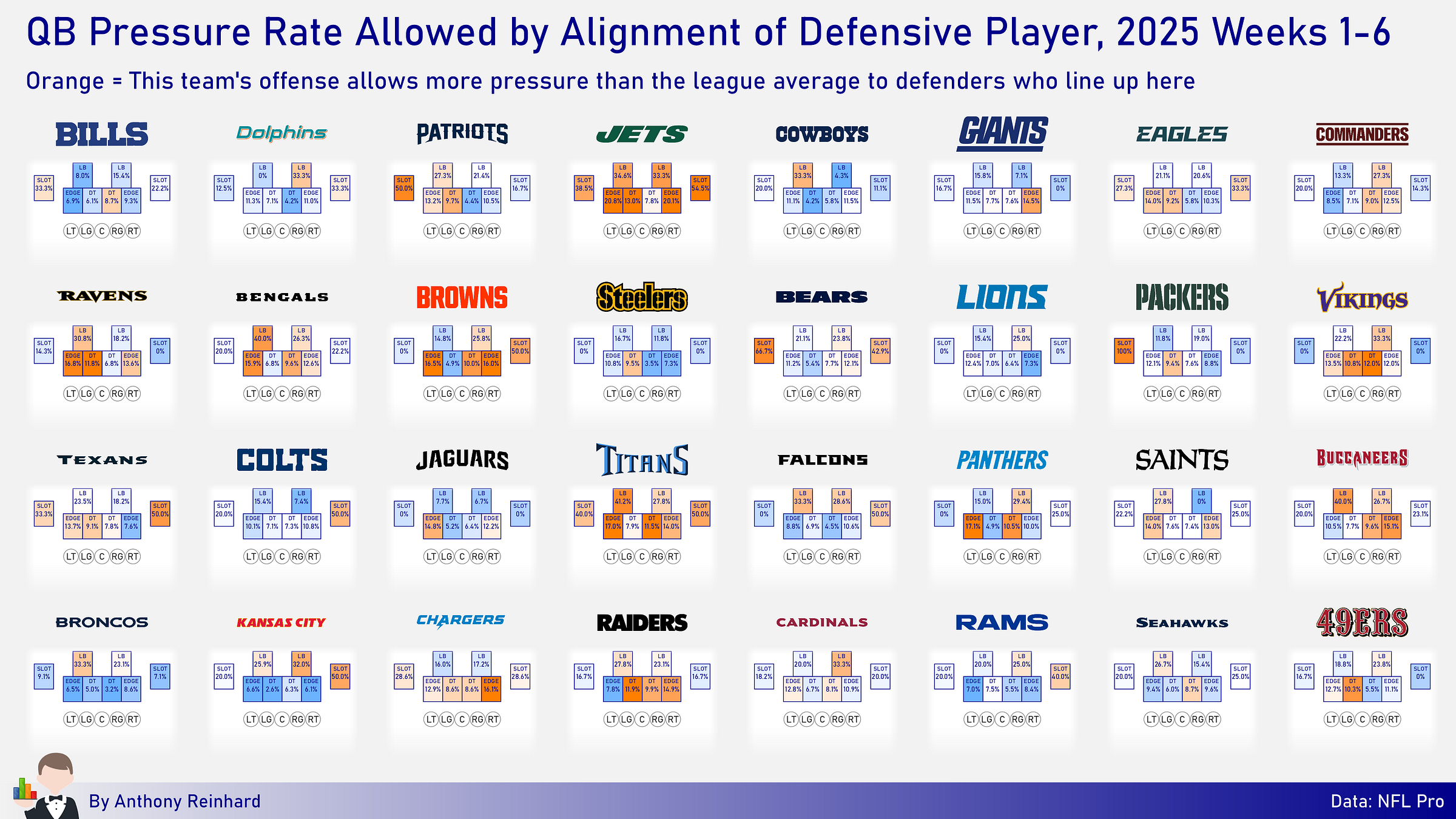 Won’t be sharing this every week as it takes a while to update. This can be helpful in identifying where an offensive line’s weak points might be.