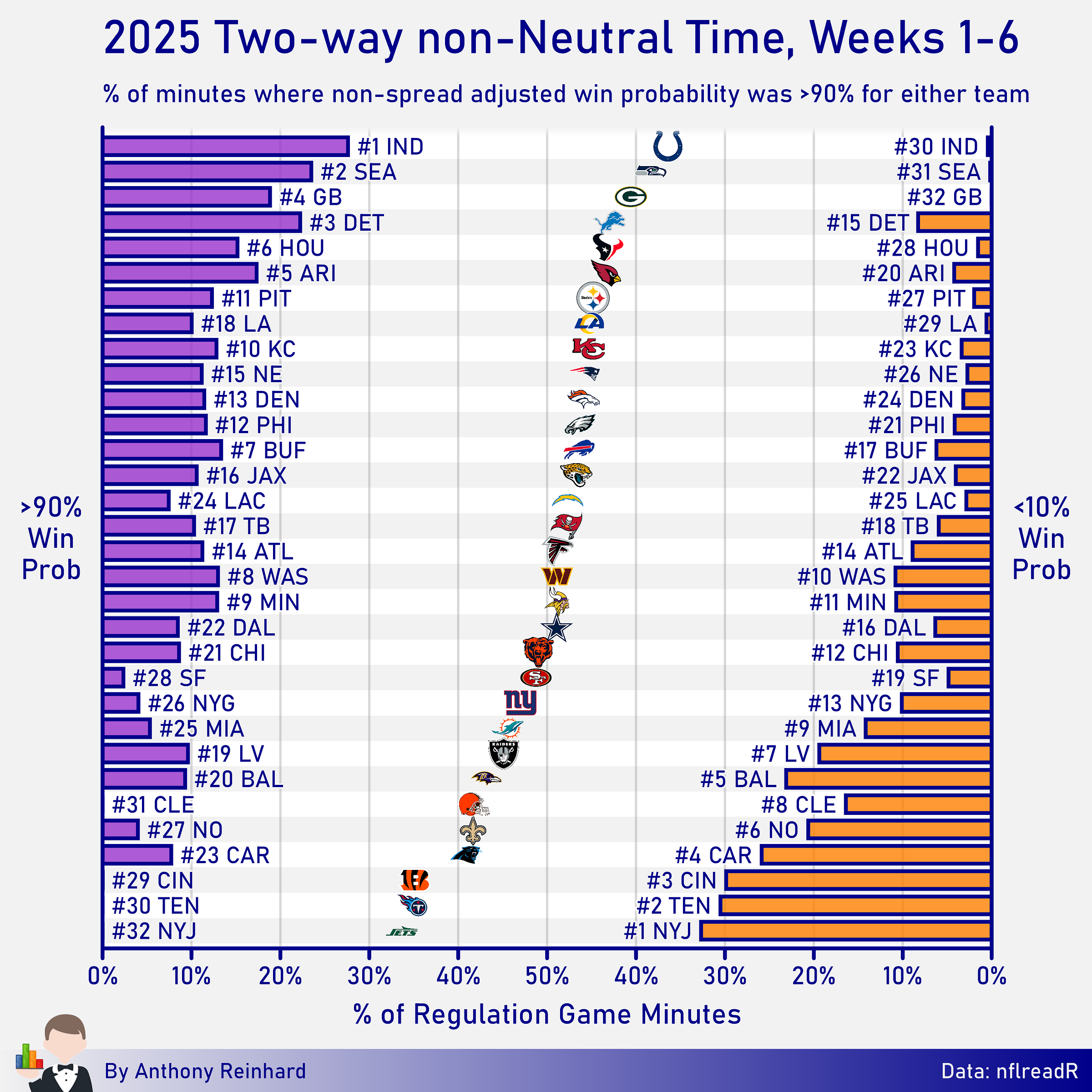This week, I’m sharing what I call “two-way non-neutral time”. This describes the % of game time that a team has had a 90% chance to win or better (purple) or a 10% chance to win or worse (orange). Green Bay is the only team to have never dropped below 10% win probability in a game this year. They tied Dallas and lost late to Cleveland. Four teams (CLE, CIN, TEN, NYJ) have not reached 90% win probability in 2025.