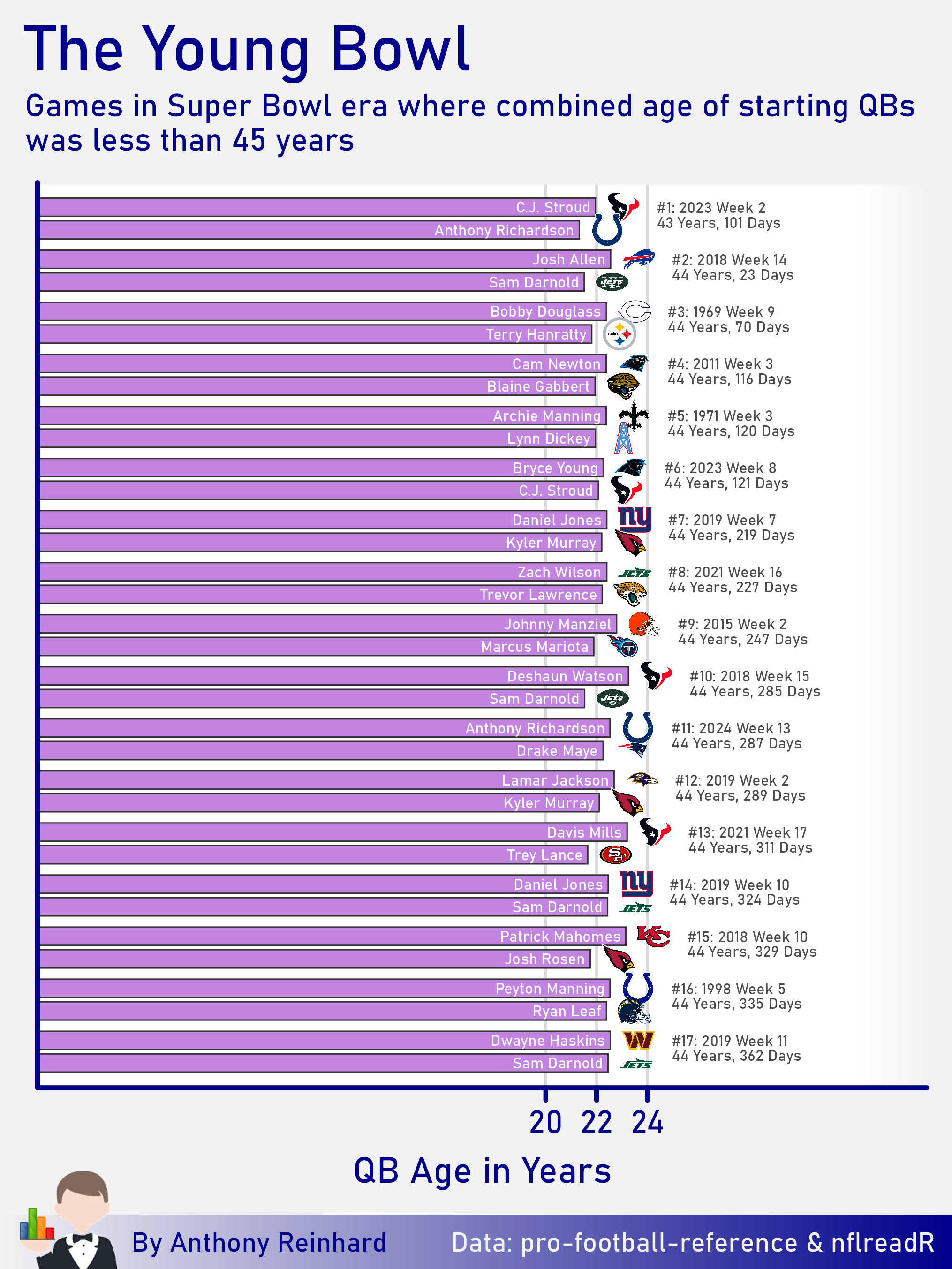 Just for fun, here are the youngest matchups. Fun fact: the 2018 Jets hosted Tom Brady and New England in Week 12 for what was, at the time, the oldest combined starting QB age in a single game. Two weeks later, Sam Darnold would take over for Josh McCown in a Week 14 game in Buffalo against Josh Allen, which was the youngest combined starting QB age game! Darnold would make the top 10 again the next week against Houston.