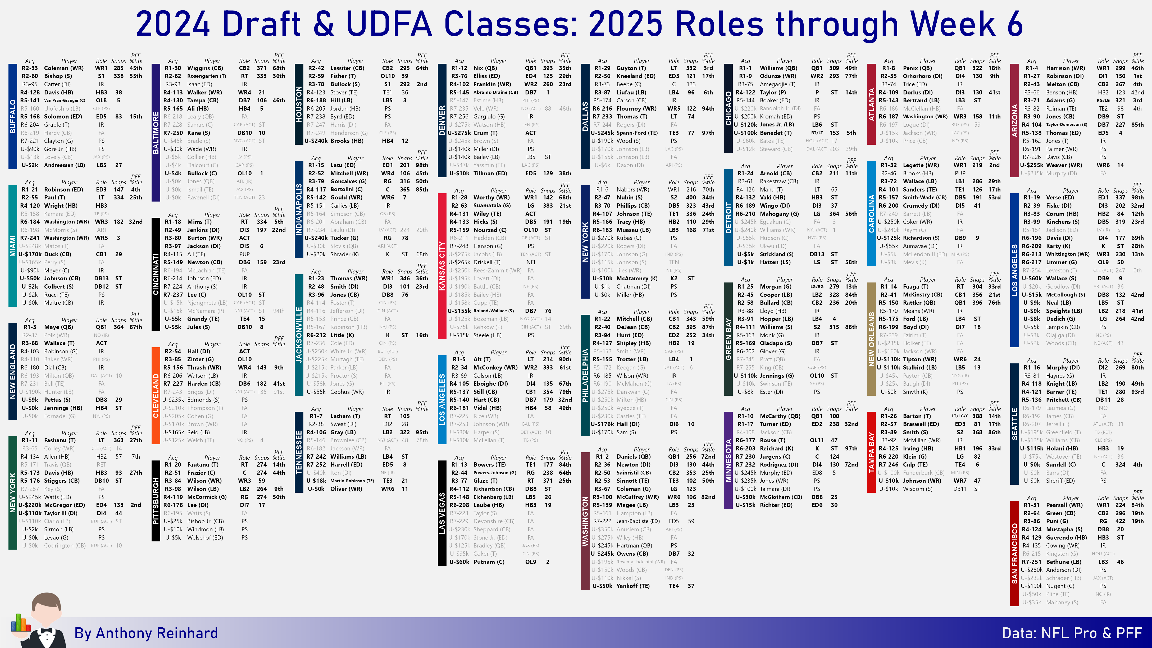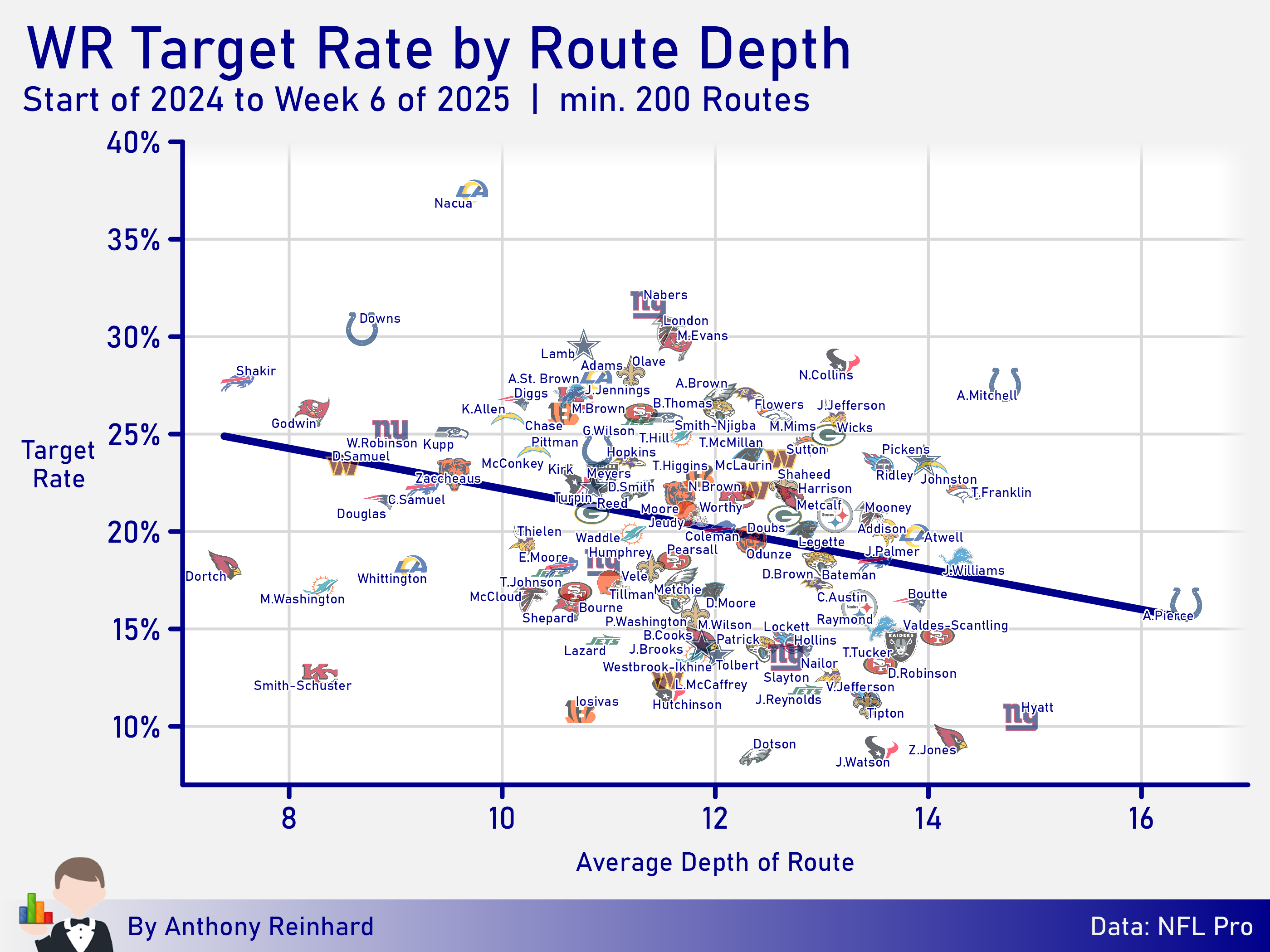 I’m a supporter of the idea that targets are earned and that pass catchers who are targeted often are among the best in the business. Target rate (defined here as targets over routes) can be depended on a players route tree though. Here, I’m showing average depth of route which is tracked by NFL Pro. This gives us classic target rate with the benefit of seeing which players are running a higher share of deep routes. Adonai Mitchell really jumps off the page here for me. He was scratched this week by the Colts, so I’m wondering if he’ll be traded before the deadline now that their pass catchers are back to full strength.