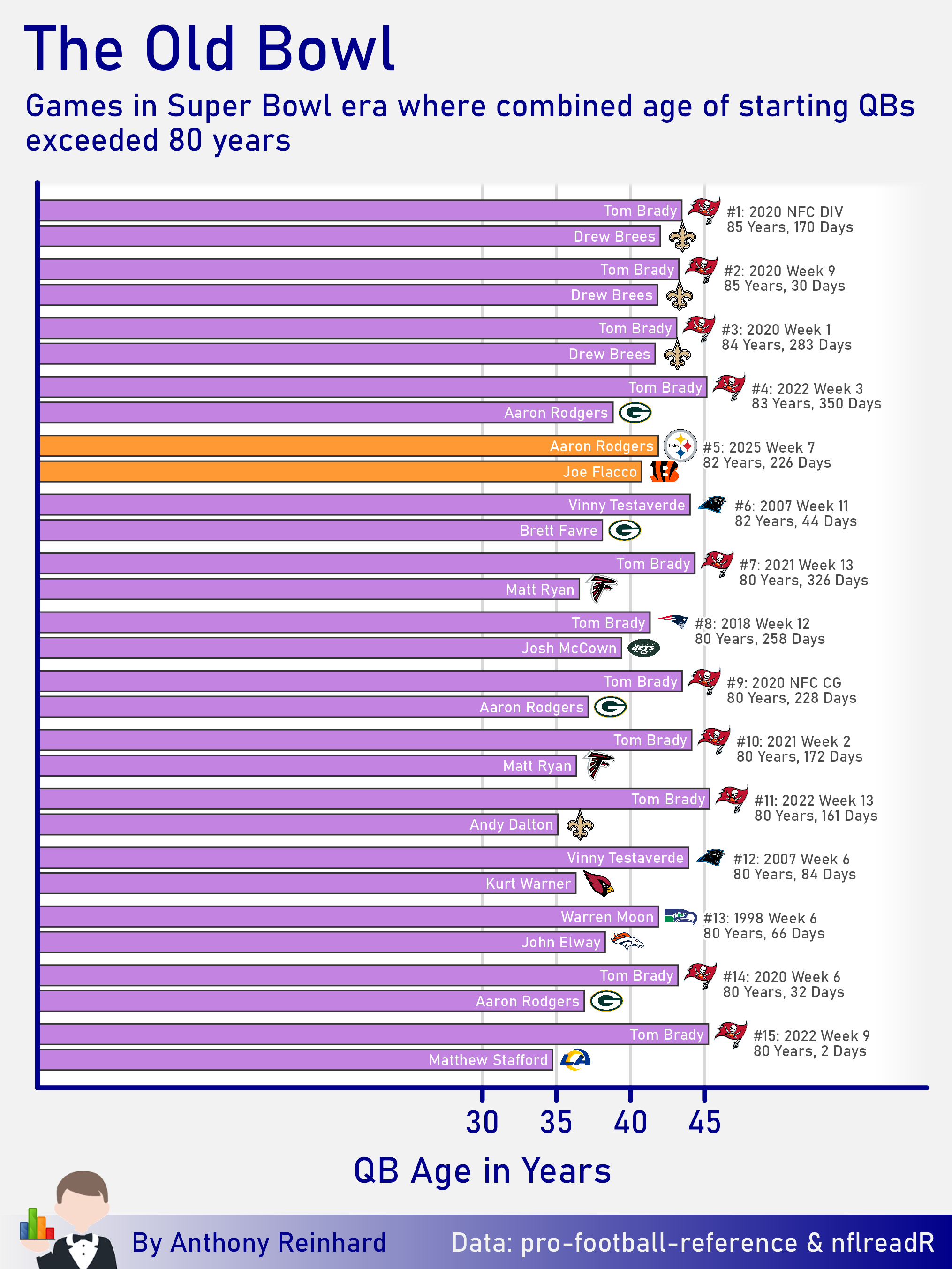 Something fun! Tonight’s Thursday Night Football matchup will feature two of the oldest QBs to ever go head-to-head. It’ll be the first time in the Super Bowl era that a pair of 40 year-old starting QBs face off that are not named Tom Brady or Drew Brees. Aaron Rodgers and Joe Flacco are a combined 82 years and 226 days old today.